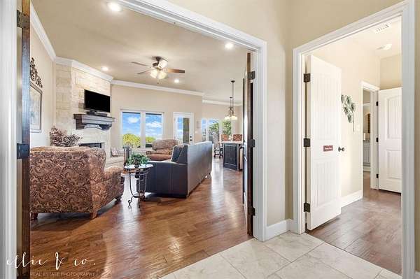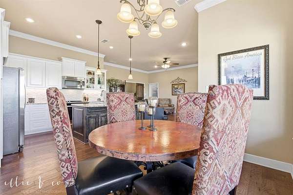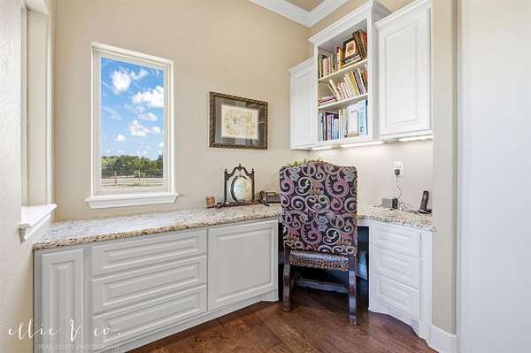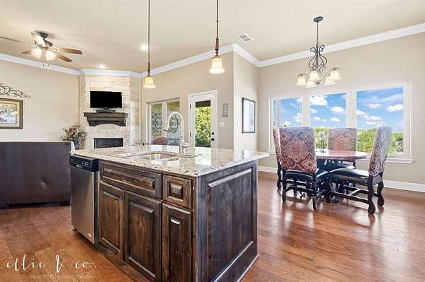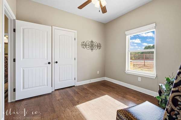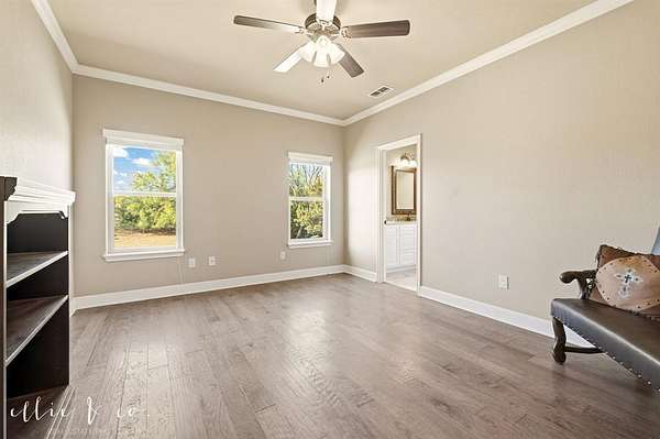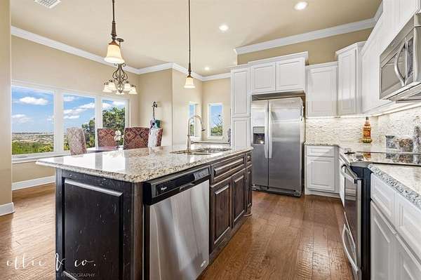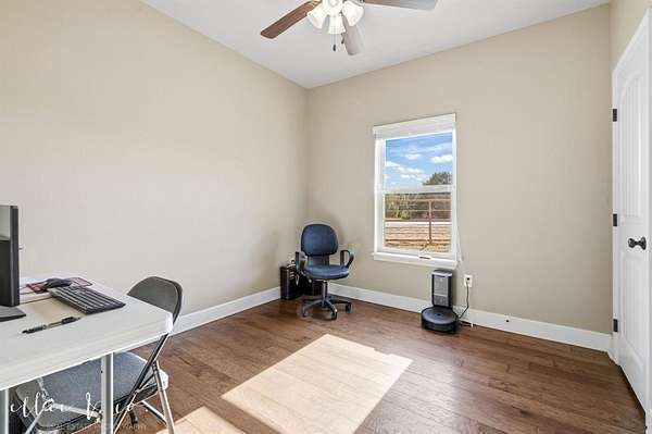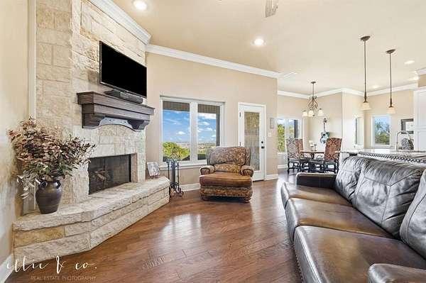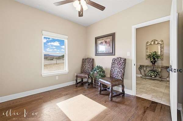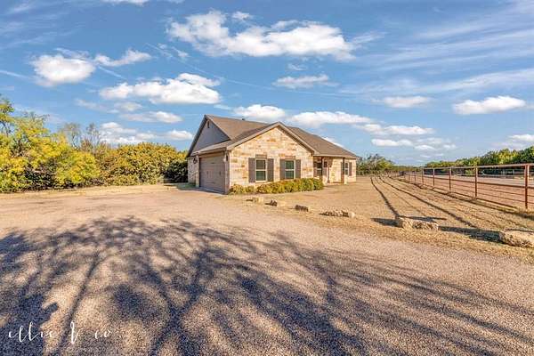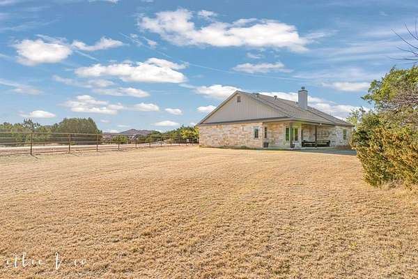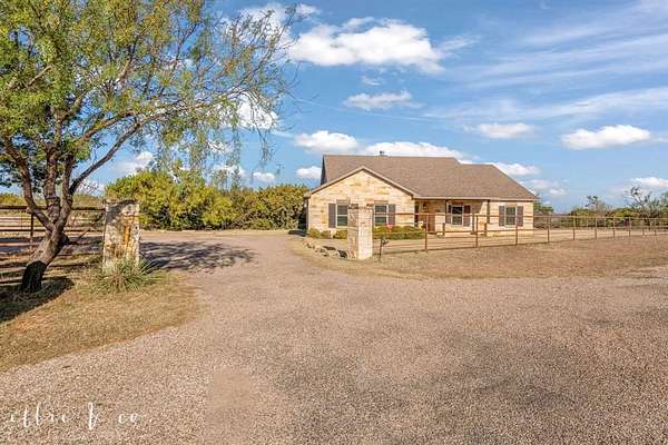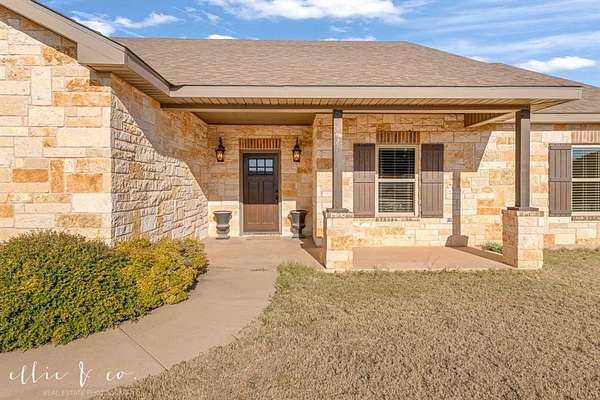 Hilltop home overlooking Abilene with stunning northern views. This 3-bedroom, 2-bathroom, 1,578 sq ft property was built in 2016 and features an open, modern layout with expansive windows offering abundant natural light, and a cozy rock corner fireplace. The home is split bedroom arrangement with primary offering a large walk in tiled shower. An abundance of painted kitchen cabinetry, a designated desk, island, and breakfast nook complete the open living space. Situated on approximately 5 private acres, this property also includes a two-car side entry garage and offers convenient access to both Buffalo Gap and Highway 83-84. Enjoy the views from the back covered patio or the front porch. The property provides peaceful, scenic living just minutes from Abilene. Wylie ISD.