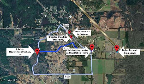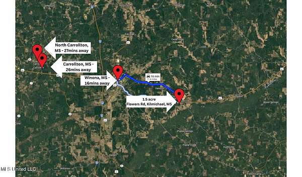 Kilmichael MS in Montgomery County 1.5 +/- Ac. Home Site on Flowers Road This charming 1.5-acre residential property in Montgomery County, MS, is just waiting for you to call it home. Nestled along a picturesque road, you'll love the perfect blend of rural tranquility and nearby conveniences. Entergy Electric and Kilmichael Water are available Feeling hungry? The cozy Debo's Corner is a quick 4-minute drive away, perfect for those nights when you don't feel like cooking. For a change of pace, Nail's One Stop is just 13 minutes down the road. Need to stock up on groceries or fill up the tank? No worries! Kilmichael Food Market is a mere 5-minute jaunt, while 4D Grocery and Circle K are 12 and 16 minutes away. How's that for convenience? But wait, there's more! While you'll love the peaceful country setting, you're not cut off from the world. Winona, the bustling county seat, is a short 20-minute drive away. There, you'll find everything from shopping to healthcare and entertainment options. It's the best of both worlds! So, are you ready to build your dream home? This 1.5-acre lot is just waiting for your personal touch. Imagine sipping your morning coffee on the porch, surrounded by nature, yet knowing everything you need is just a stone's throw away. Take advantage of this fantastic opportunity to create your little piece of heaven in the heart of Mississippi Directions to the land: From Highway 82 on the North side of Kilmichael go South on N Rutherford Drive (Hwy 182) for 9/10 mi. then Right on Money Ave. for 2/10 Mi. Then Right on Pine Dr. for 4/10 MI. Then bear left on Flowers Rd. for 4/10 mi. to the land on the Right. A close Street address I 170 Flowers Road Kilmichael MS 39747