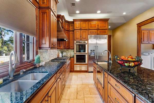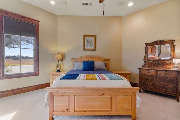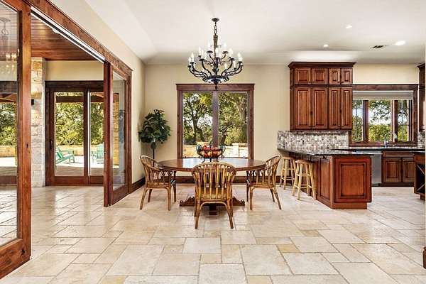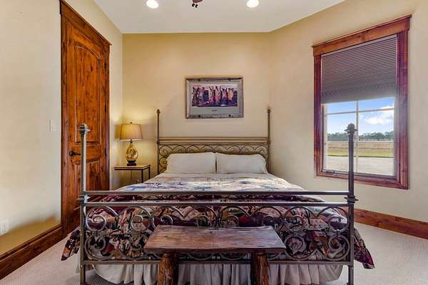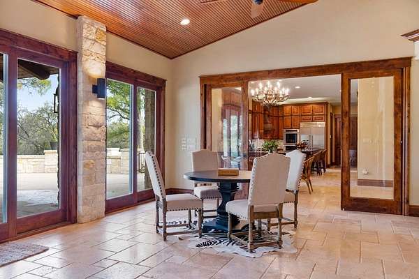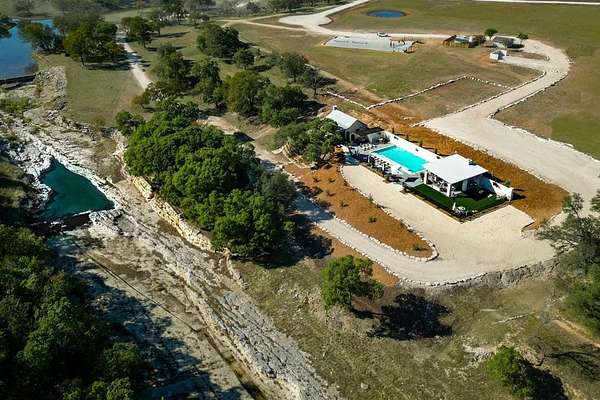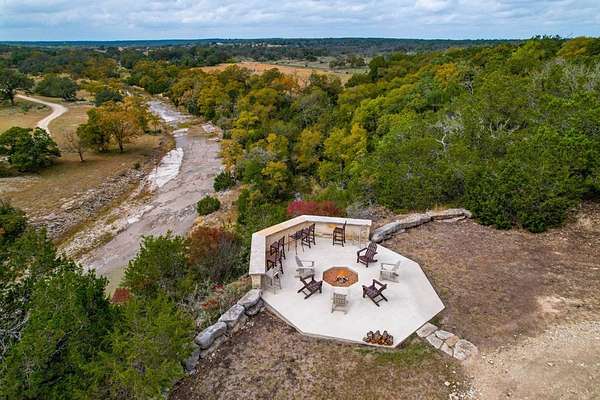 Experience the best of both worlds at this breathtaking 10.57-acre live water ranch, where serene Hill Country landscapes meet refined comfort and modern ease. Nestled in a lush bend of spring-fed Stevens Creek--and secured by a concrete dam that ensures year-round water flow--this turnkey estate invites you to swim, kayak, fish, or simply unwind along your own private stretch of live water. Located within one of the Hill Country's most prestigious and thoughtfully designed communities, it offers an extraordinary blend of elevated rural living, long-term investment appeal, and seamless access to upscale dining, boutique shopping, and everyday essentials. The main residence, a beautifully crafted 2013 White Rock home, is gracefully tucked beneath tall oak canopies, surrounded by native wildlife and dramatic creekside bluffs. From the moment you arrive, the attention to detail is clear--from the expansive paved circle drive and porte-cochere to the grand western statue that welcomes guests at the entrance. Inside, custom finishes abound: heavy wrought iron double doors, hand-hewn cedar beams, vaulted wood ceilings, rich woodwork, and multiple fireplaces set the tone. The open-concept kitchen is both stylish and functional, featuring a large island, high-end appliances, and a walk-through butler's pantry. Step outside to the vaulted, cedar-beamed back patio, where an expansive stone terrace stretches beneath the oaks and overlooks the creek--perfect for quiet mornings or lively outdoor gatherings. One of the home's most impressive and unique features is the indoor/outdoor firepit room, thoughtfully designed for year-round enjoyment. This grand entertaining space includes a floor-to-ceiling gas firepit, recessed rock wet bar with cedar beam accents, wine cooler, mini fridge, and built-in grill with vent hood. With a full wall of sliding glass doors that open to the outdoors and interior doors that close it off from the rest of the house, the space easily transforms for the season, weather, or occasion. Down a stone path from the main home sits the Game House--an inviting space perfect for entertaining and hosting guests. With a cozy living area, a full bath, cedar bar, built-in kegerator, and plenty of room for games and lounging, this space functions beautifully as a second living quarters, private hangout, or creative retreat. This incredible estate is located within the prestigious Maverick community, a high-end, amenitized development known for its privacy, beauty, and attention to detail. Residents enjoy a high-fenced perimeter with roaming exotic wildlife, a gated entrance, paved roads, underground utilities, on-site groundskeeper, fiber internet, and more. With live water, luxury improvements, and multiple acreage purchase options available, this one-of-a-kind retreat offers the perfect blend of natural serenity, upscale living, and future flexibility--all in the heart of the Texas Hill Country.