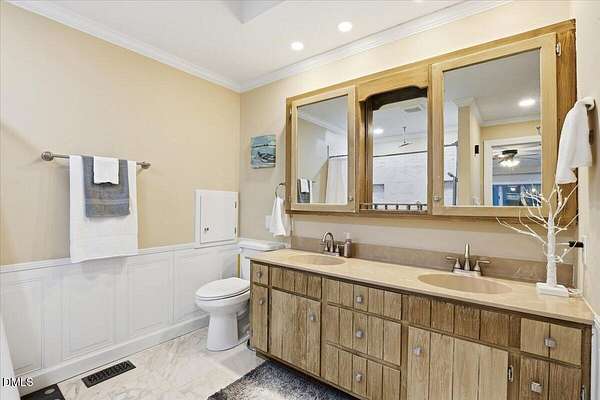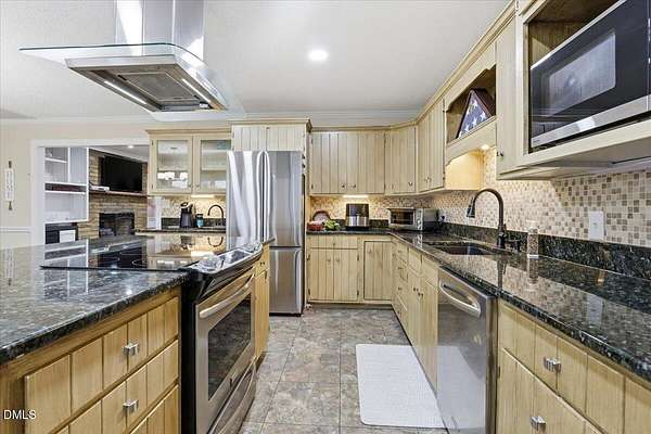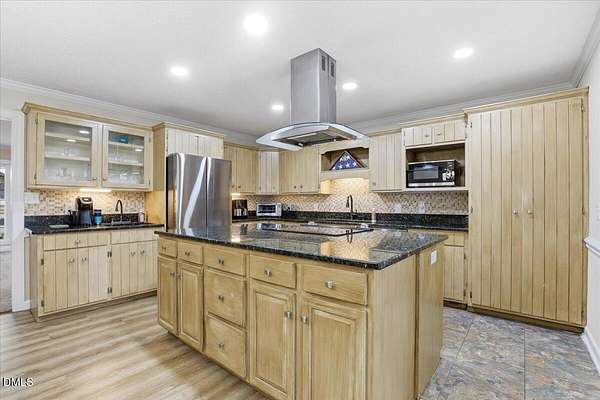 - Bookcases, Ceiling Fan(s), Crown Molding, Double Vanity, Eat-In Kitchen, Granite Counters, Kitchen Island, Walk-In Closet(s), Walk-In Shower