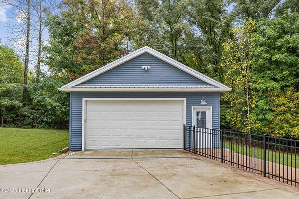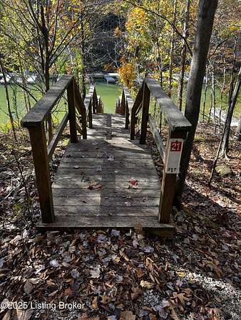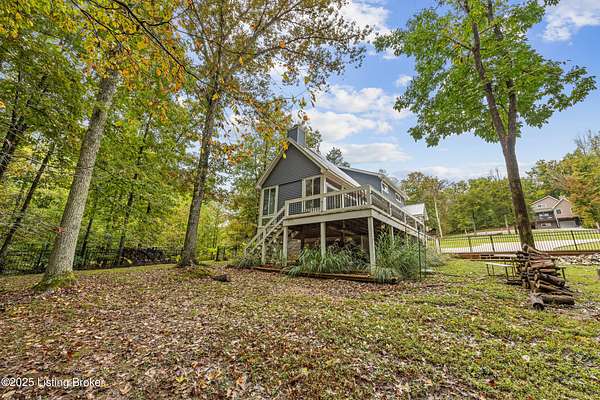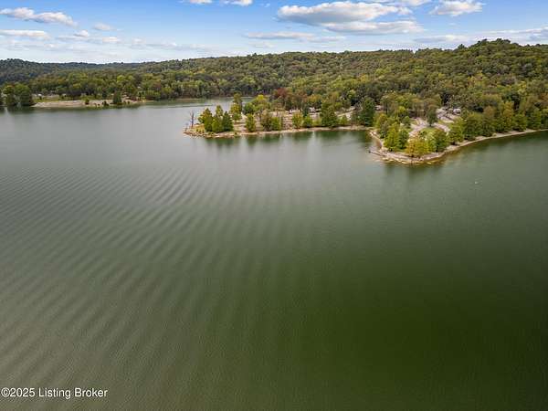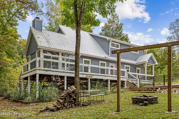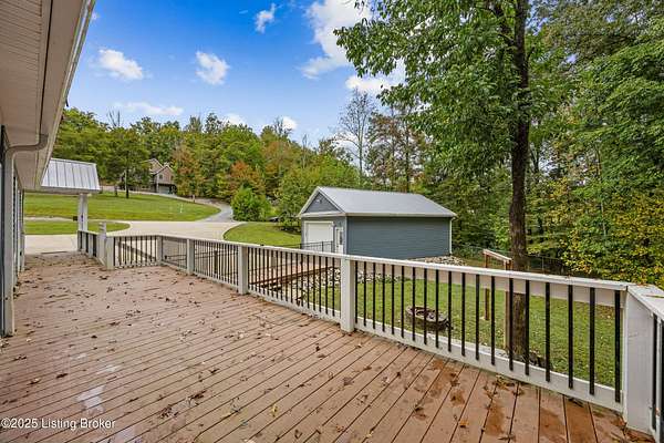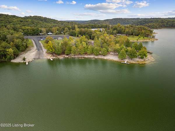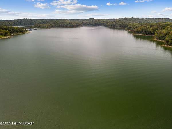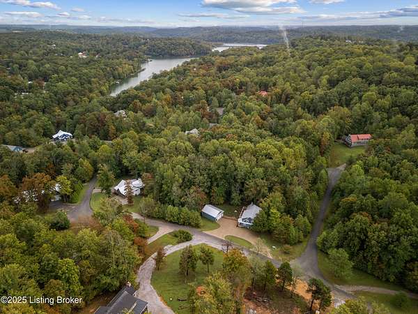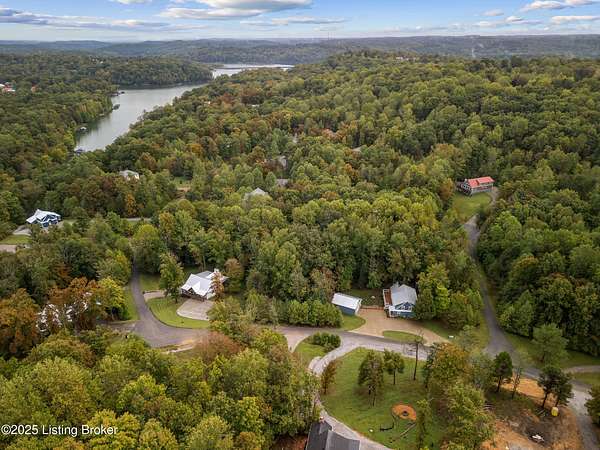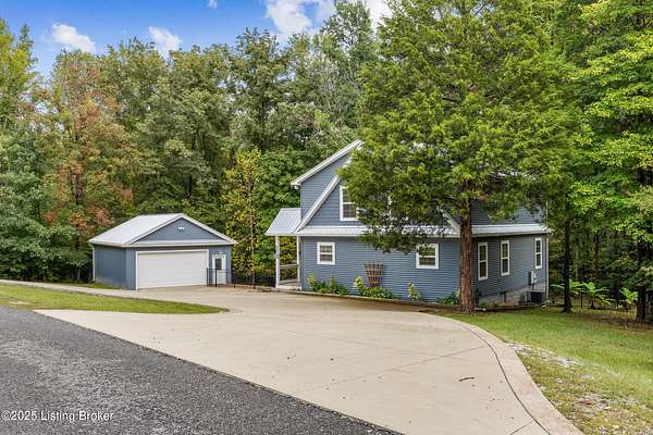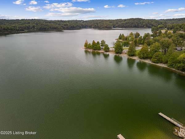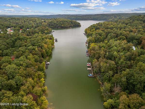 BEST price + OWNED dock = true lake living! Just a 10 minute walk or 3 minute golf cart/ATV ride gets you to your OWN dock for Nolin Lake adventures! This custom 4-bedroom retreat in gated Moutardier Woods is designed with space for the whole family! It features two living areas-a vaulted family room plus a bright sunroom with floor-to-ceiling stone fireplace that brings the outdoors in year-round. The first-floor primary suite, custom kitchen, and hand-scraped wood floors blend comfort with style perfectly. Step onto the huge deck to unwind in nature or watch the kids or pets play in the fenced yard! Then sit around your firepit and stargaze all night. A huge detached garage will hold all your lake toys! Campground and marina just down the street too. An all-seasons lake escape awaits!