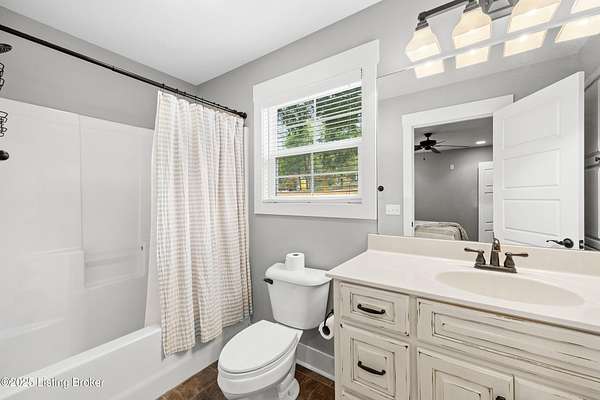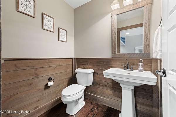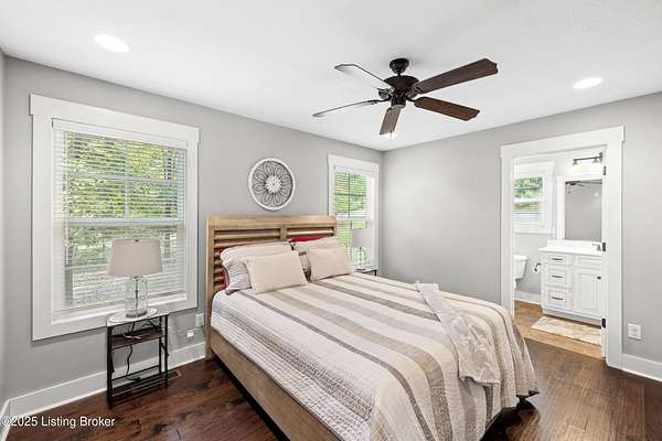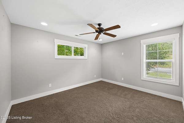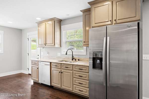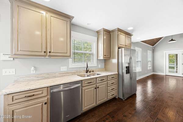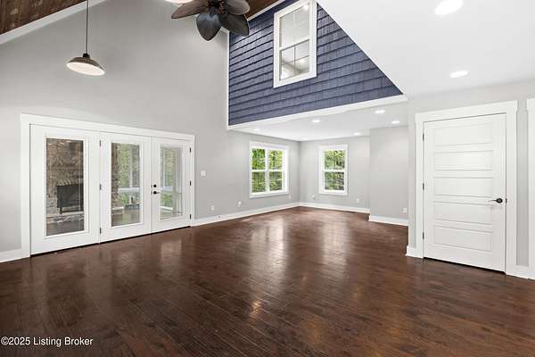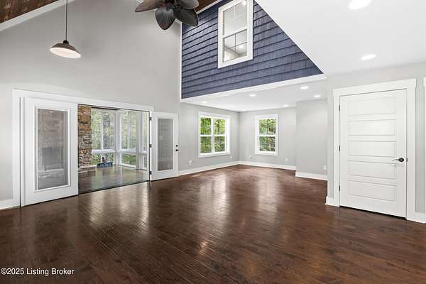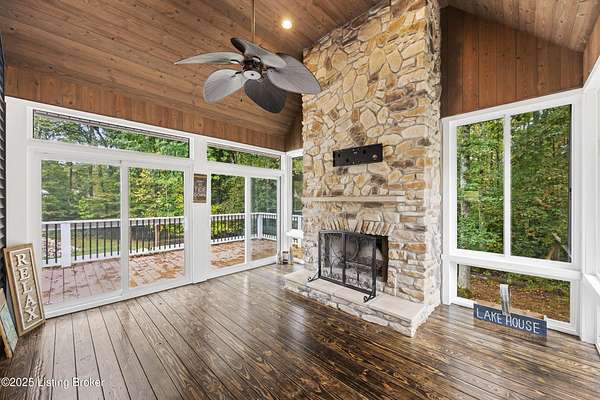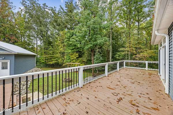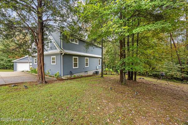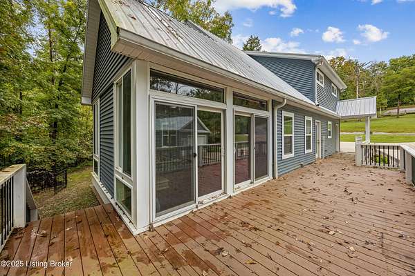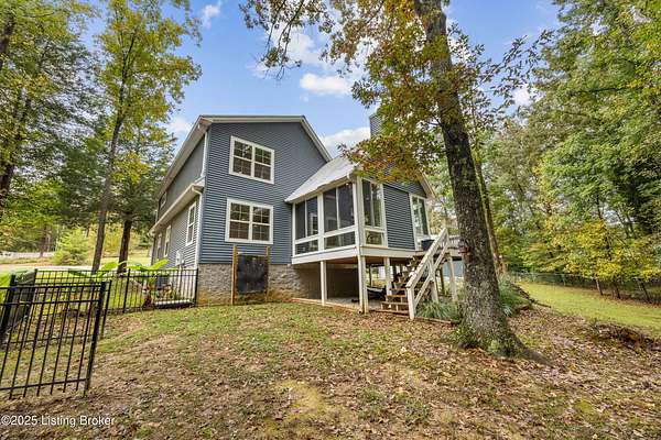 BEST price + OWNED dock = true lake living! Just a 10 minute walk or 3 minute golf cart/ATV ride gets you to your OWN dock for Nolin Lake adventures! This custom 4-bedroom retreat in gated Moutardier Woods is designed with space for the whole family! It features two living areas-a vaulted family room plus a bright sunroom with floor-to-ceiling stone fireplace that brings the outdoors in year-round. The first-floor primary suite, custom kitchen, and hand-scraped wood floors blend comfort with style perfectly. Step onto the huge deck to unwind in nature or watch the kids or pets play in the fenced yard! Then sit around your firepit and stargaze all night. A huge detached garage will hold all your lake toys! Campground and marina just down the street too. An all-seasons lake escape awaits!