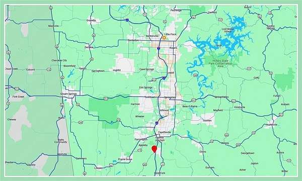 Heading South on I-49 from Fayetteville, take Exit 58, turn right on W Wilson St. In 900 feet take a left on Cato Springs Rd. In 350 ft turn left into Sonic and park in the back. Destination is and adjacent to the west of Sonic, wraps around the south side of Sonic.