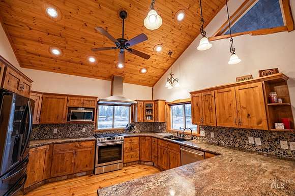 A true gem in Prairie Idaho.This custom Precision Craft log cabin is nestled in the most beautiful place, tucked back in the pine trees where you can find peace and serenity.1hr from Boise situated on a spacious 52 acres of land with a year round creek, large shop, 20x20 barn, wine cellar, corral & hay fields. Be captivated by the large, open living room with vaulted ceilings bathed in natural light. Enjoy the warmth of the wood fireplace & heated floors providing a cozy retreat. The heart of the home, the stunning kitchen with alder cabinets, granite countertops creating an inviting space for culinary delights.The master suite beckons with a luxurious jacuzzi tub & walk in shower creating a spa-like oasis. Step outside into your private paradise under a covered patio the ideal setting for relaxation and entertaining. The home is equipped with a 16,000 watt generator for back up offering peace of mind. Immerse yourself in the beauty of the mountains enhancing the overall lifestyle experience.