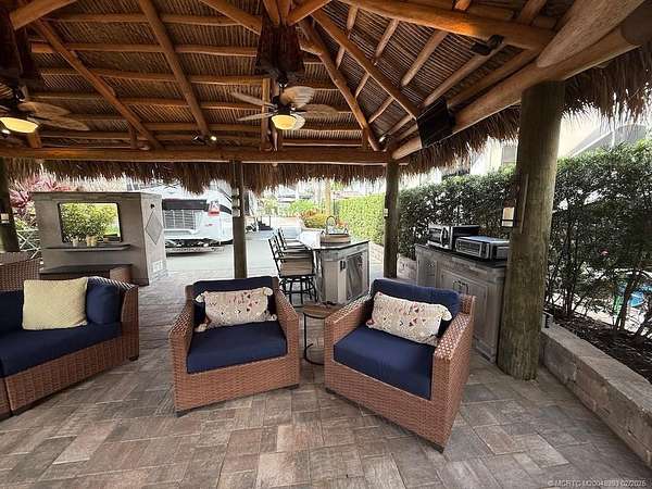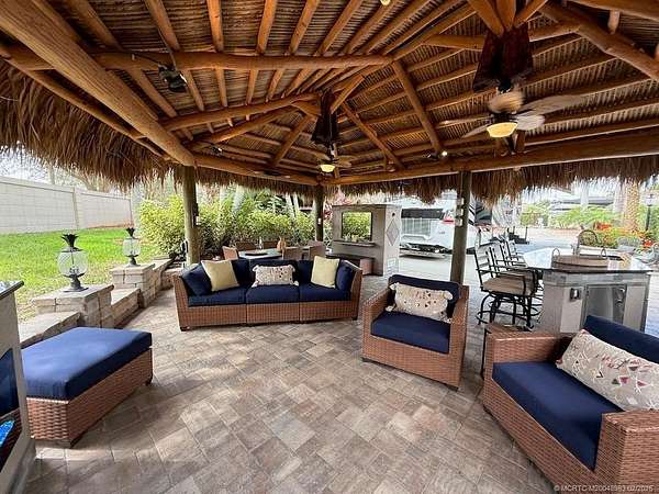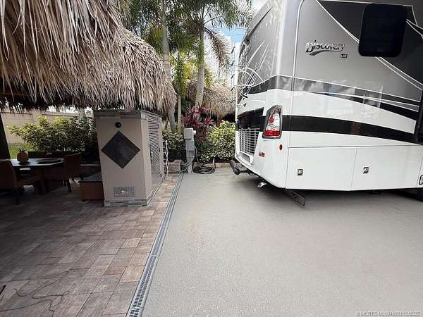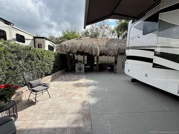 Immaculate and move in ready! This spacious 2,868 sq. ft. lot offers the perfect blend of comfort and style, making it feel just like home. The large tiki hut is beautifully designed with a decorative fan pole and provides an ideal space for relaxation and entertaining. Inside the tiki, you'll find a well-appointed galley kitchen with granite countertops and bar, a built-in electric fireplace, and a wall-mounted flat-screen TV-perfect for cozy evenings. A custom storage unit with decorative shelving adds both functionality and charm. The space is tastefully furnished with a dining table and chairs, as well as a comfortable sofa and seating area for ultimate relaxation. The extra-wide lot offers plenty of room for entertaining in a private, tropical setting. Priced to sell, this exceptional property is a definite must see!