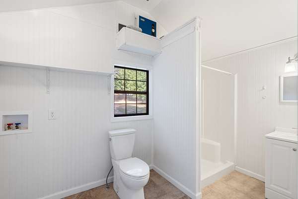The spacious owner's suite offers a large walk-in tiled shower, private toilet room, a huge linen closet, and access to the backyard and outdoor shower. Enjoy peaceful evenings on the oversized screened-in porch!