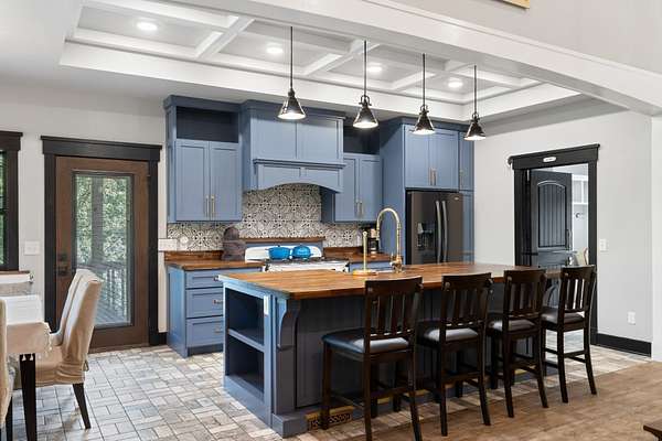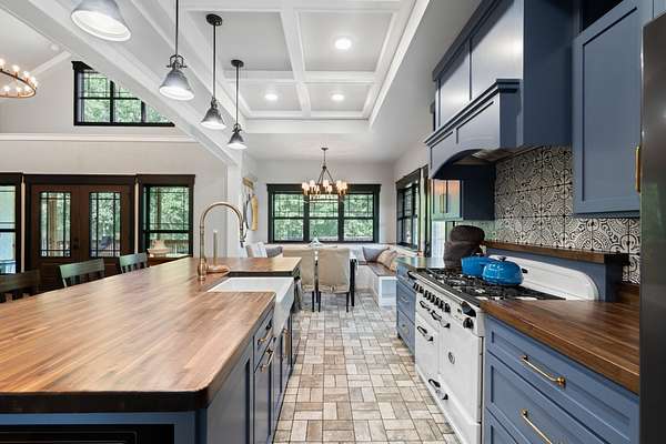 The kitchen boasts custom cabinetry, a farmhouse sink, butcher block counters, and an AGA Legacy gas cooktop. Additional upgrades include a custom banquette seating with storage in the dining nook, and a large walk-in pantry!