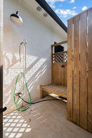 The spacious owner's suite offers a large walk-in tiled shower, private toilet room, a huge linen closet, and access to the backyard and outdoor shower. Enjoy peaceful evenings on the oversized screened-in porch!
