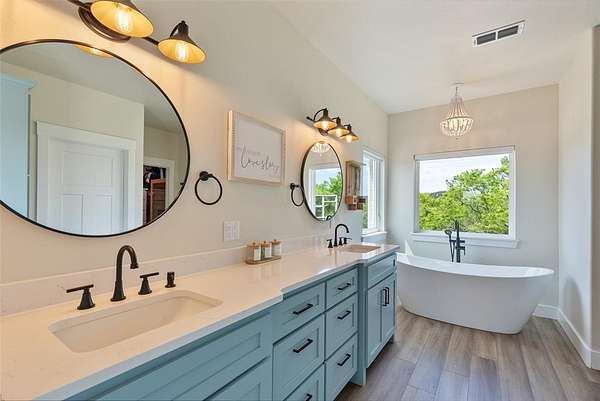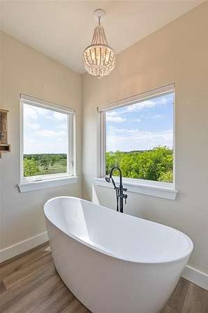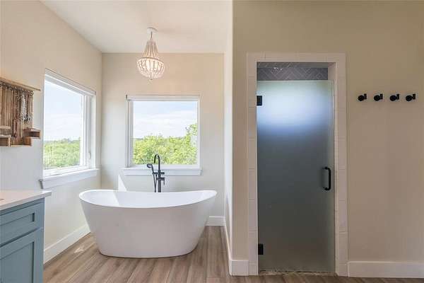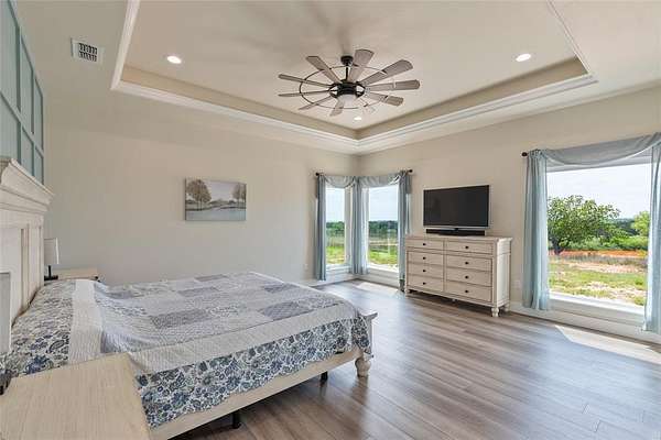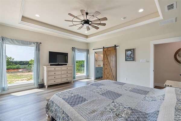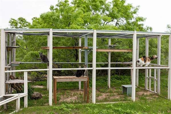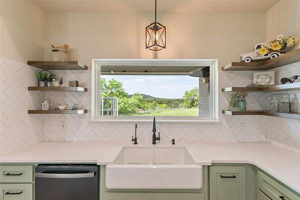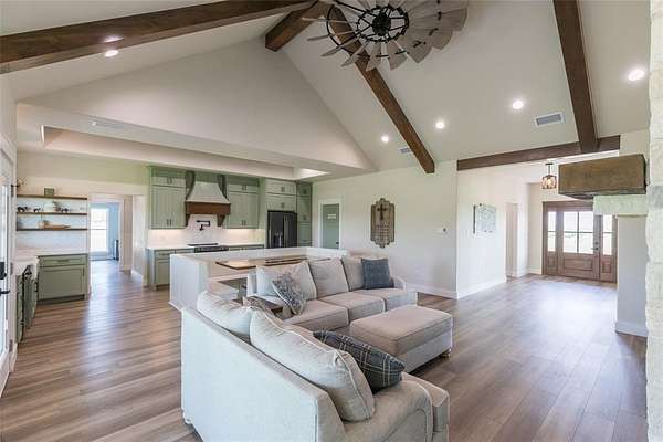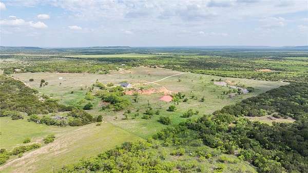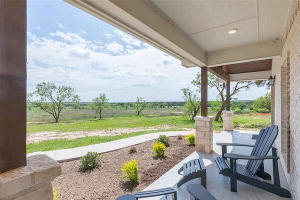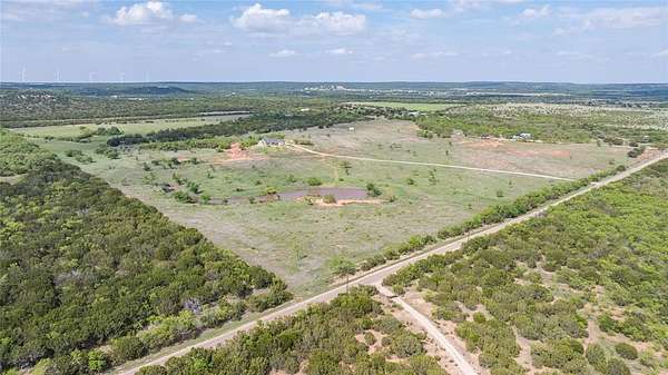This custom-built home on 47.23 acres in Ovalo offers privacy, functionality, and scenic West Texas views with two ponds and elevated terrain. Inside, you have an open-concept layout featuring a stone fireplace, vaulted ceilings with exposed beams, and a thoughtfully designed kitchen with custom cabinetry, quartz countertops, farmhouse sink, pot filler, and black slate appliances. The home includes four bedrooms, three full bathrooms, abundant built-in storage, and a spacious primary suite with dual vanities, freestanding tub, and walk-in shower with dual shower heads. Built for efficiency and comfort, the property features spray foam insulation, an 18 SEER Bosch HVAC system, water softener with recirculation, and insulated interior walls. Located in Jim Ned ISD just south of Abilene, this property combines modern construction with land, privacy, and long term value.