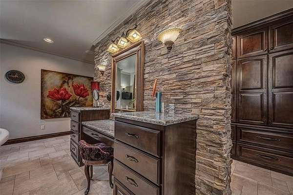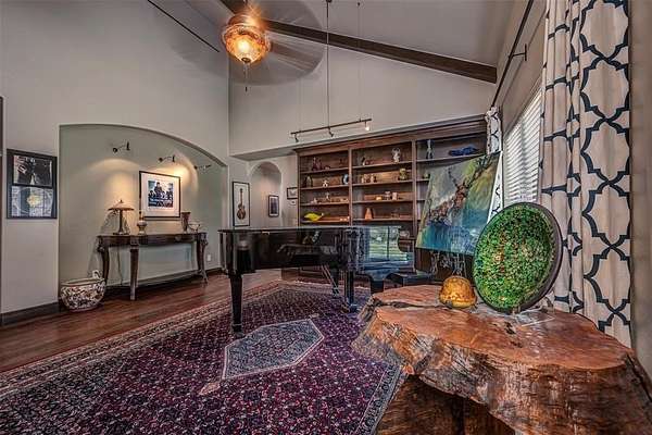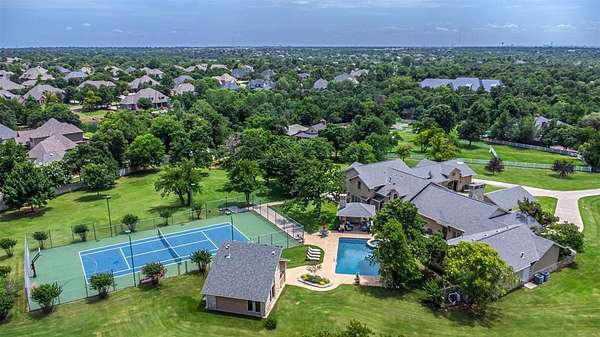 Exquisite home on 5 acres at Coffee Creek and Santa Fe in Woodhill Addition. This home was originally built in 1978. After a tornado hit, it was added on to and approx. 2/3 of the house was redone in 2012. Blueprints available. A cabana with outdoor kitchen, sparkling pool, 658 sq. ft. pool house not included in the sq. ft. with a full kitchen, bath, a wet dry sauna, and the pool table stays, sport court for tennis, pickle ball, basketball and shuffleboard, and a 404 sq. ft. workshop. Larger workshops are allowed. Horses and barns are also allowed. A circle drive and porte-cochere, and a 4-car side garage leaves plenty of room for extra parking. The sprinkler system covers the 5 acres, and it along with the pool are on well water. The house is on City of Edmond water and utilities. There is a formal living room, study/library, family room, music room, hobby room with exterior ventilation, workout room, and an additional sitting area off of guest bedroom. There are 4.5 baths in the main home, and one in the pool house. All bedrooms are large with access to a bathroom. Bedrooms 2 and 3 share a Jack and Jill bath with an additional laundry facility. One bedroom and bath are upstairs. Inside you will find soaring, beamed ceilings, wood flooring, and lighted insets to display your artwork. There is a double-sided fireplace between the living and formal dining. A butler's pantry off of formal dining will hold all of your beautiful glassware. There is a large media room with a projector and screen that stays with the home. Truly a chef's gourmet kitchen with Wolf, Sub Zero, and Kitchen Aide appliances. The primary suite has a cozy fireplace, his and her closets, a double vanity, a makeup vanity, beautiful soaking tub, and large walk-in shower. Tons of storage in this home including 1900 sq. ft. of storage off of the upstairs landing. Storm shelter. The house and cabana got a new roof in October of 2025 This home has been well loved and will be missed