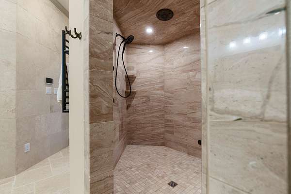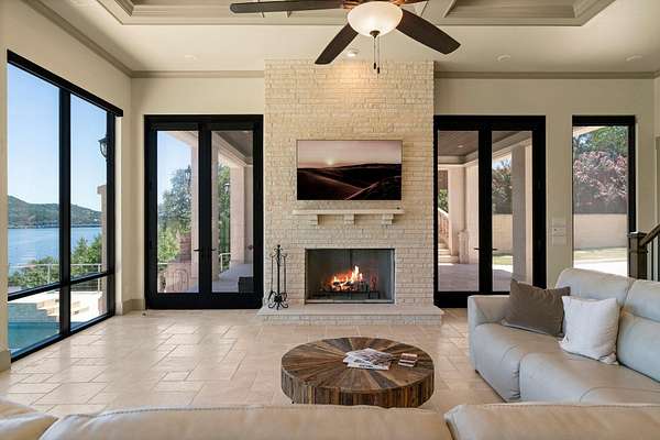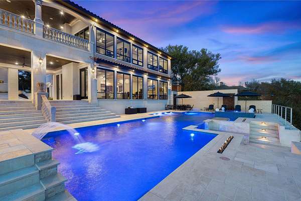 Welcome to a rare opportunity to own one of Lake Travis' most breathtaking private estates, offering 7,813 sqft of total living space across three exquisitely appointed structures: a 5,882 sqft main residence, a 1,259 sqft two-bedroom guest house, and a dedicated private gym, all nestled on a stunning, 1.98 acre multi-tiered property with direct lake access and panoramic views. The main residence is a masterclass in refined luxury, featuring five spacious rooms, four bedrooms each with its own spa-style ensuite bath, and a fifth room currently serving as a private office with access to a nearby full bath. A private elevator connects both levels of the home, while a state-of-the-art theatre room and dramatic great room with floor-to-ceiling windows showcase the lush grounds, resort-style pool, and glittering waters of Lake Travis. At the heart of the home lies a showpiece chef's kitchen, outfitted with Thermador built-in appliances, custom cabinetry, and generous prep space, designed for elevated everyday living and effortless entertaining. Outside, the estate transforms into a private resort, complete with a spectacular pool featuring a glass viewing window, a firepit lounge, and expansive outdoor living spaces designed for golden hour gatherings. Just steps from the pool, a beautifully crafted steam sauna is perfectly positioned to capture uninterrupted lake views, offering a restorative retreat like no other. The guest house provides an additional layer of luxury, with two bedrooms, a full bath, and an airy open-concept living space that opens to a private balcony. A private hillside tram gracefully connects each tier of the property, leading to your exclusive dock on Lake Travis and making lake days effortless. Fully automated with a Control4 smart home system for remote control of lighting, security, climate, and entertainment, this one-of-a-kind property is offered fully furnished, turn-key, and curated to the highest standards of lakeside living.