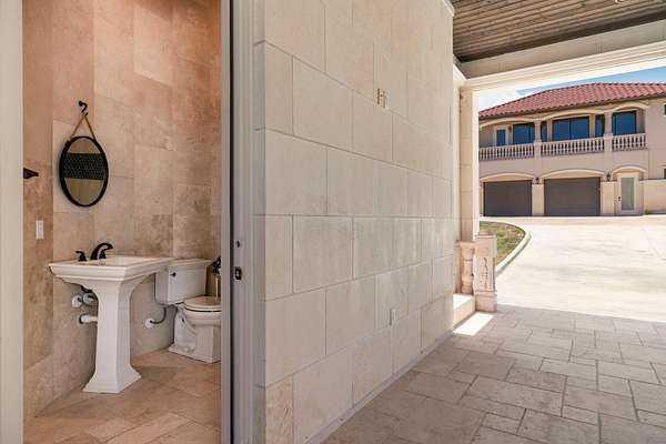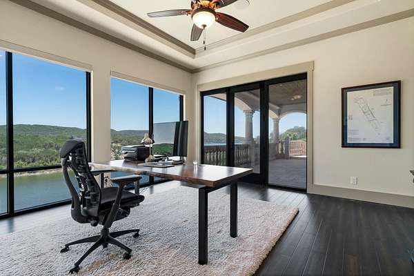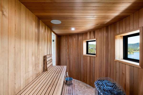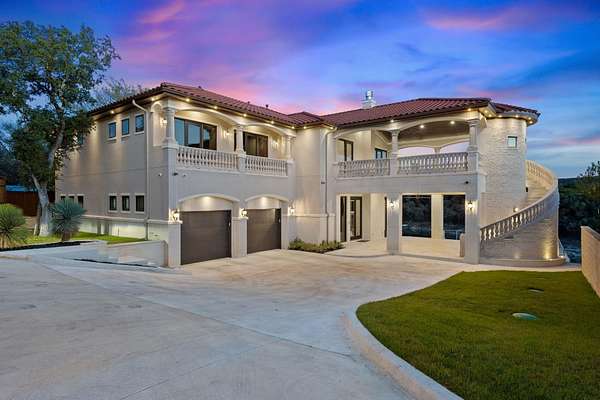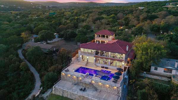 Welcome to a rare opportunity to own one of Lake Travis' most breathtaking private estates, offering 7,813 sqft of total living space across three exquisitely appointed structures: a 5,882 sqft main residence, a 1,259 sqft two-bedroom guest house, and a dedicated private gym, all nestled on a stunning, 1.98 acre multi-tiered property with direct lake access and panoramic views. The main residence is a masterclass in refined luxury, featuring five spacious rooms, four bedrooms each with its own spa-style ensuite bath, and a fifth room currently serving as a private office with access to a nearby full bath. A private elevator connects both levels of the home, while a state-of-the-art theatre room and dramatic great room with floor-to-ceiling windows showcase the lush grounds, resort-style pool, and glittering waters of Lake Travis. At the heart of the home lies a showpiece chef's kitchen, outfitted with Thermador built-in appliances, custom cabinetry, and generous prep space, designed for elevated everyday living and effortless entertaining. Outside, the estate transforms into a private resort, complete with a spectacular pool featuring a glass viewing window, a firepit lounge, and expansive outdoor living spaces designed for golden hour gatherings. Just steps from the pool, a beautifully crafted steam sauna is perfectly positioned to capture uninterrupted lake views, offering a restorative retreat like no other. The guest house provides an additional layer of luxury, with two bedrooms, a full bath, and an airy open-concept living space that opens to a private balcony. A private hillside tram gracefully connects each tier of the property, leading to your exclusive dock on Lake Travis and making lake days effortless. Fully automated with a Control4 smart home system for remote control of lighting, security, climate, and entertainment, this one-of-a-kind property is offered fully furnished, turn-key, and curated to the highest standards of lakeside living.