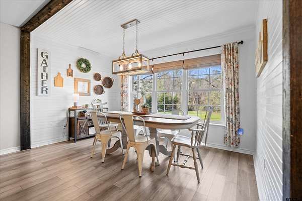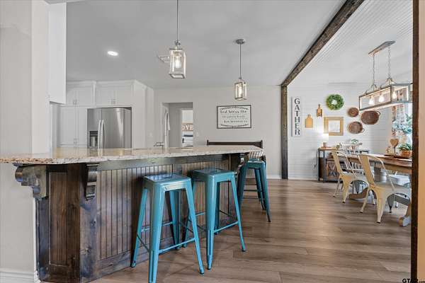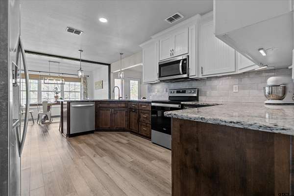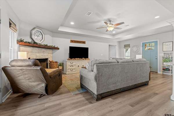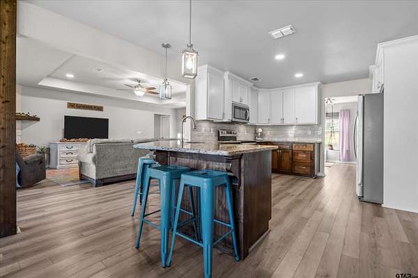 Country Life with All the Amenities! Experience the best of both worlds—peaceful country living with modern conveniences—in this beautiful home nestled on 2 sprawling acres between Jacksonville and Bullard. Enjoy easy access to schools, shopping, and restaurants while still having the serenity of rural life. Built in 2020, this home offers peace of mind with newer construction and Fidelity National Home Warranty coverage that can be continued by the buyer. Step inside to an inviting open-concept layout featuring a split floor plan with 4 bedrooms and 3.5 bathrooms—a rare find in East Texas! The living room boasts a tray ceiling, abundant natural light, and a stone wood-burning fireplace with a beautiful wood mantle. Luxury vinyl plank flooring runs throughout the home—no carpet—for easy maintenance and timeless appeal. The modern kitchen is a dream with granite countertops, a stylish tile backsplash, shaker-style soft-close cabinetry, pendant lighting, and a breakfast bar that opens to a spacious dining area overlooking the private backyard. Retreat to the primary suite featuring a spa-like en suite with dual granite vanities (including a makeup area), a garden tub with tile surround, a walk-in shower, and a large walk-in closet. Three additional bedrooms and two well-appointed full bathrooms provide plenty of space for family or guests. A flex room includes a half bath and can easily serve as a home office, formal dining room, game room or even a 5th bedroom. Additional features include a large mudroom with storage and laundry area, and a walk-in pantry. Step outside to enjoy your covered back porch—complete with a porch swing—perfect for sipping morning coffee or relaxing on peaceful evenings. An outdoor shower adds a touch of country charm and convenience for outdoor enthusiasts. Additional acre is available to make your backyard picturesque! This home truly has it all—don't miss your chance to call it home!