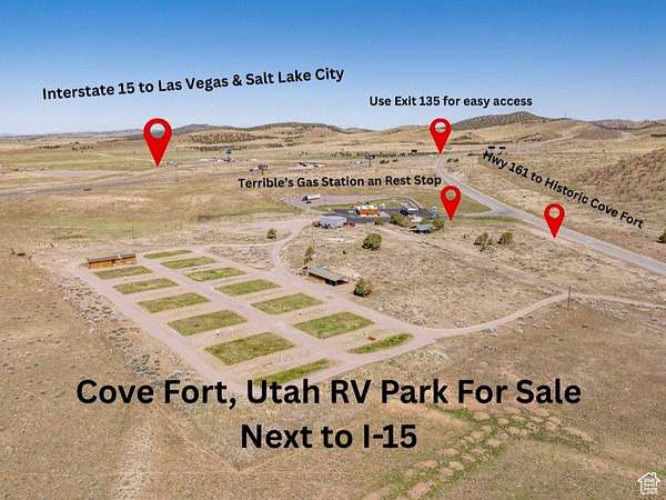 Est $4,974/moRV Park with on-site manager living quarters. This is a turn-key operation at historic Cove Fort, in Central Utah. 33 Full hook-ups with room to grow. Ideal location at the intersection of I-15 and I-70 for all the traffic passing through, as well as the short-term construction projects in the area. Facility has grass areas for each of the main sites and a shared laundry/restroom & shower facility. Property's west boundary line has frontage along I-15. Additional acreage available if buyer wants more property surrounding the site. Acreage is estimated for listing purposes. Access: From I-15 exit 135, head east to the Terrible's gas station entrance, drive south in their parking lot past the building to the entrance of the RV park.