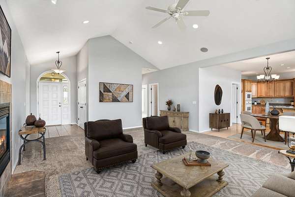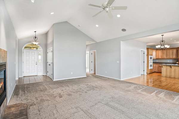 - Ceiling Fan(s), Central Vacuum, Double Vanity, Enclosed Toilet(s), Fiberglass Stall Shower, Laminate Counters, Linen Closet, Open Floorplan, Primary Downstairs, Shower/Tub Combo, Soaking Tub, Vaulted Ceiling(s), Walk-In Closet(s), Wired For Sound