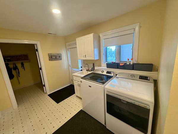 Inside, you'll be welcomed by a spacious, open floor plan designed for both everyday living and entertaining. The modern kitchen is a chef's dream, featuring sleek countertops, ample cabinetry, and updated appliances, with easy access to dining and living areas. Just off the kitchen, a generously sized laundry room includes an impressive storage area--perfect for pantry items, cleaning supplies, or seasonal storage.