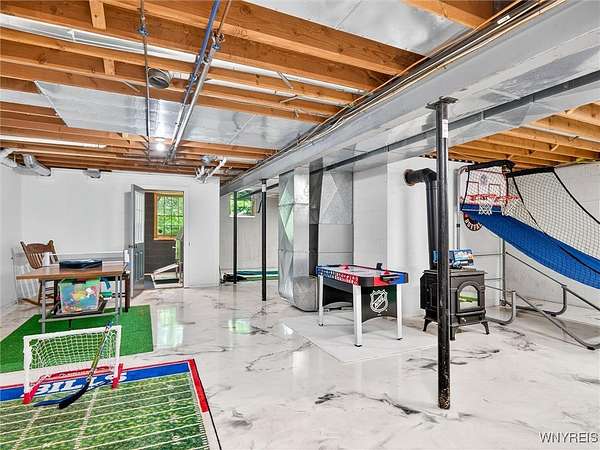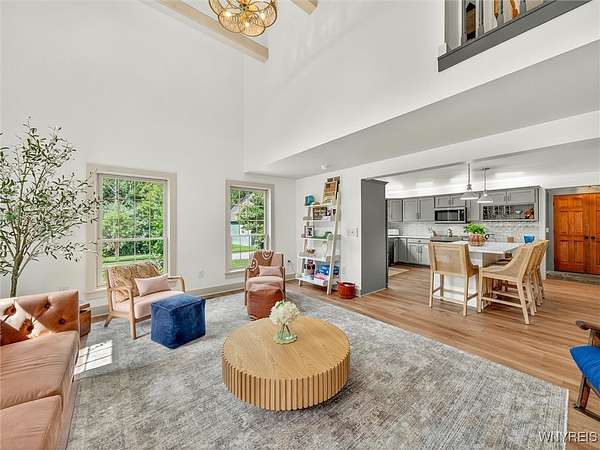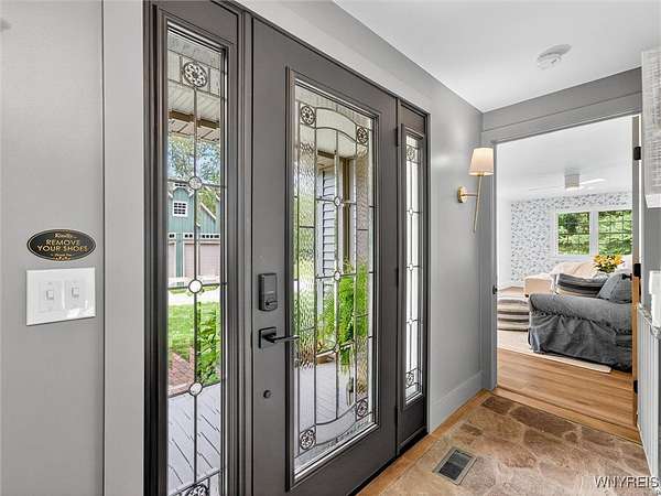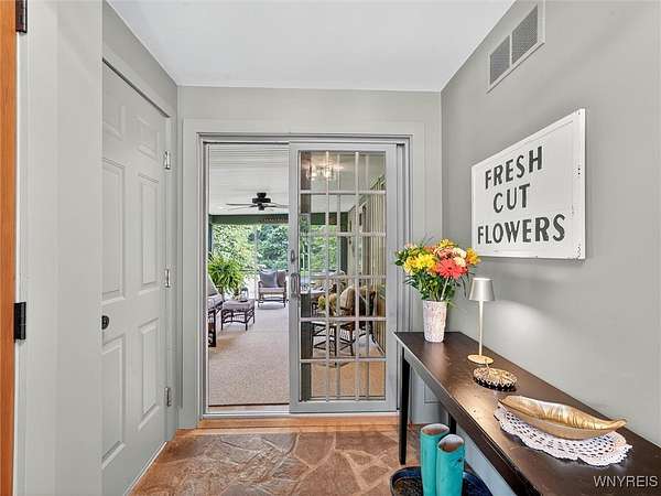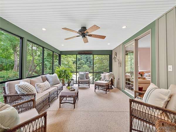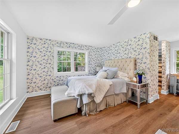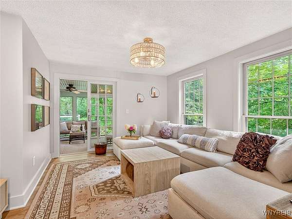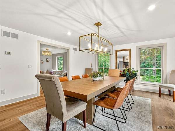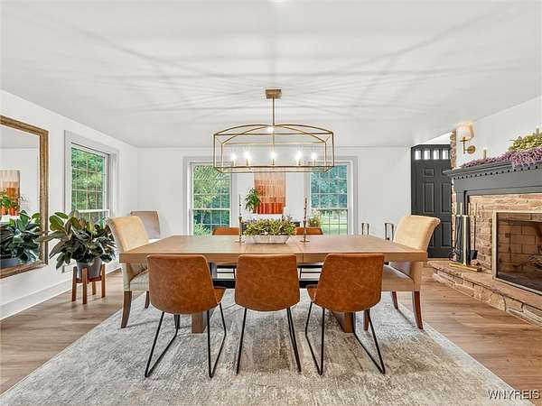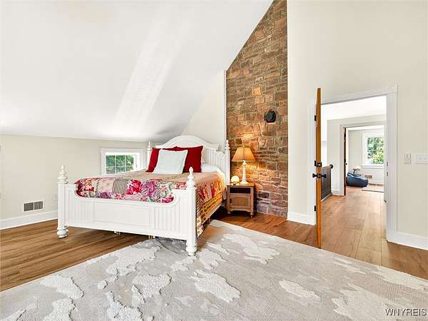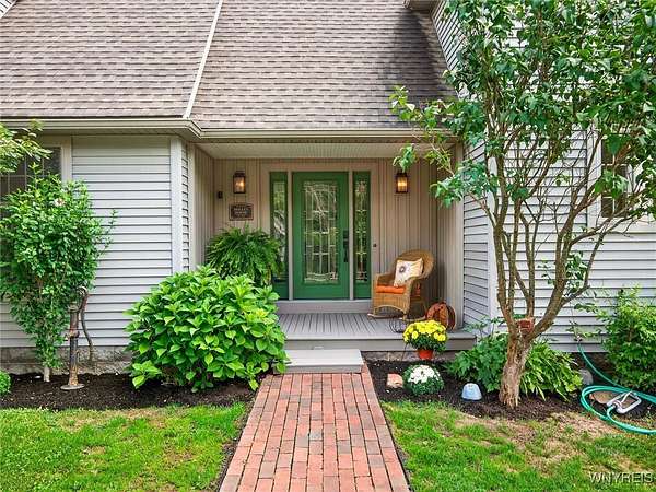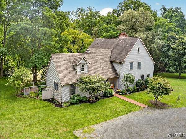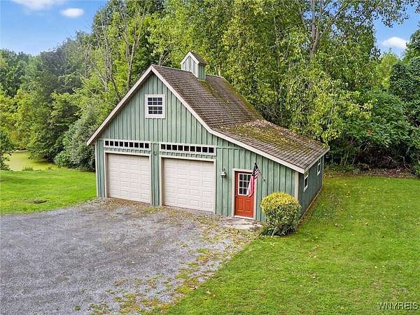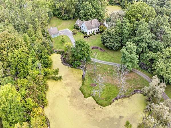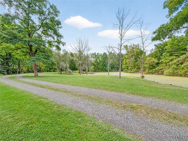 A meandering driveway leads to this stunning and tranquil country estate, nestled on 20 acres that feature serene ponds, quarries, and lush woodlands. This secluded haven is a dream for nature enthusiasts, offering unparalleled privacy and scenic water features throughout the expansive property. The harmonious blend of woods, water, open fields, and abundant wildlife creates an inviting atmosphere for those looking to immerse themselves in the beauty of nature. The residence itself is elegantly designed, featuring two master suites-one on each level. The first floor showcases an open layout that includes a modern chef's kitchen equipped with high-end appliances, quartz countertops, an island, a wine bar, and a spacious pantry. Adjacent to the kitchen, a cozy informal living area with a wood-burning stove and soaring cathedral ceilings provides a warm retreat. An impressive dining room, complete with a wood-burning fireplace, is perfect for entertaining and family gatherings. The authentic cathedral two story crafted fireplaces that ascend through the living room and dining room were crafted from stone sourced directly from the quarry located on the property, Additionally, a stylish half bath and a sitting room overlooking the picturesque pond and wooded landscape lead to a screened-in porch, ideal for enjoying the outdoors during the warmer months. Ascending the open staircase to the second floor reveals the second master suite. This level also includes a second bedroom, a den or office, a full bath, laundry area, and boasts a full open deck with the landing offering a view of the first floor below. The partially finished basement serves as a children's playroom and features a full stainless steel dog spa. A conveniently located two-story detached garage with space for 2 1/2 cars complements the property, which is enhanced by meticulously maintained landscaping. 25 minutes to Rochester airport and 55 minutes to the Buffalo Airport! Numerous sophisticated enhancements and updates are present throughout. This exquisite property is not to be missed. Delayed negotiations until September 16, 2025 at 1pm.