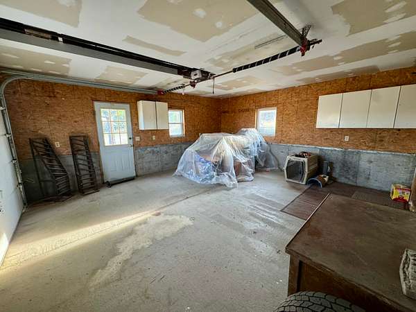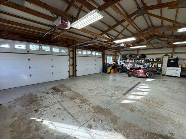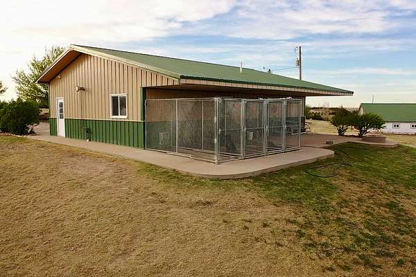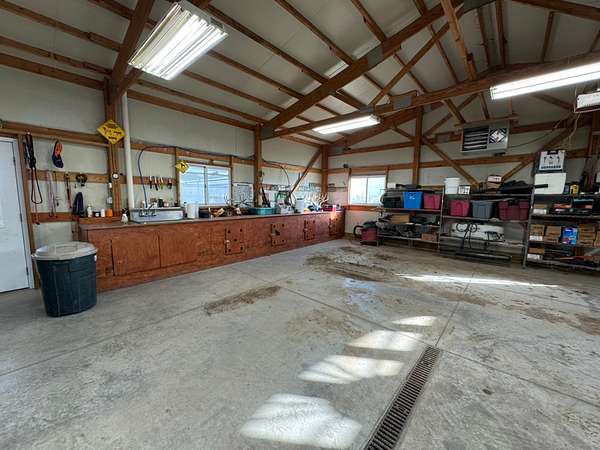 A heated detached garage serves as a functional workshop space and includes 4 built-in dog kennels with indoor dog houses. An older dairy barn remains on the property and provides additional storage or utility potential.