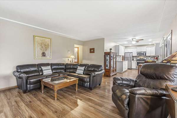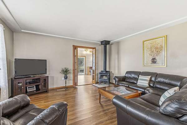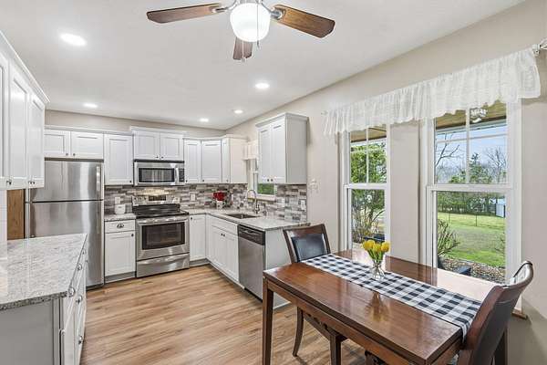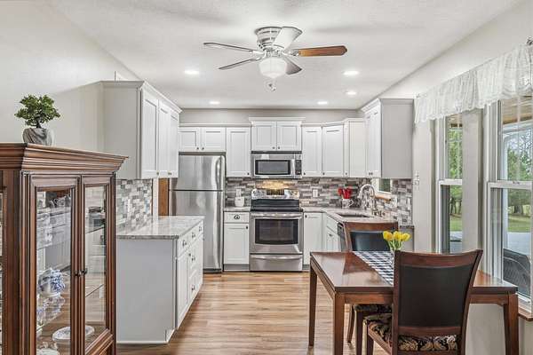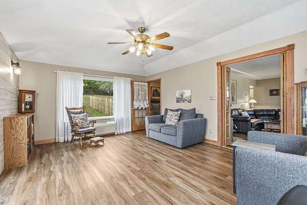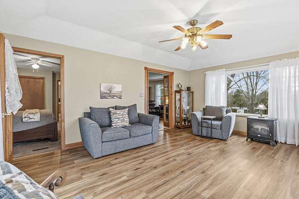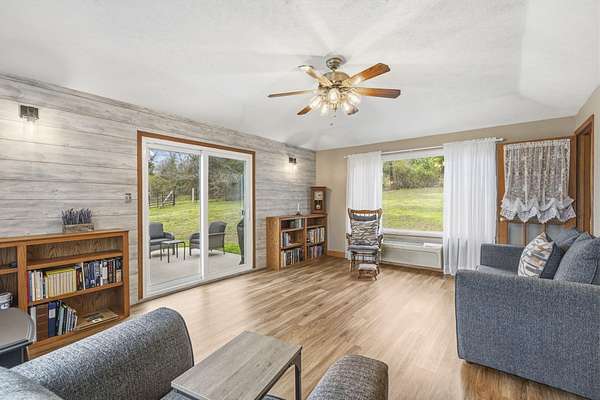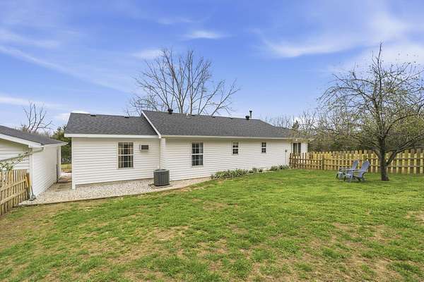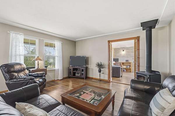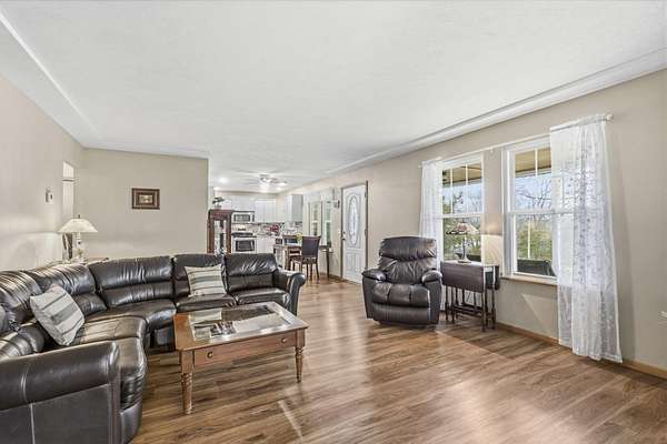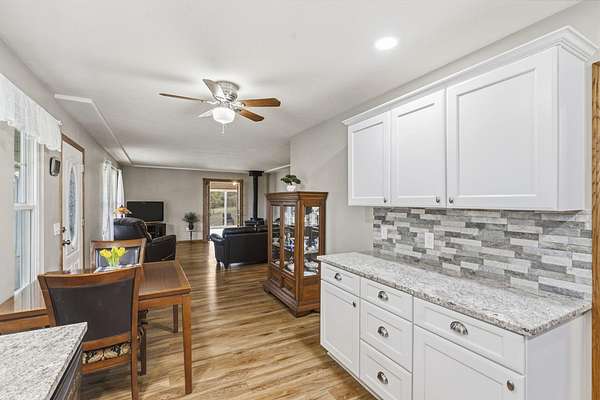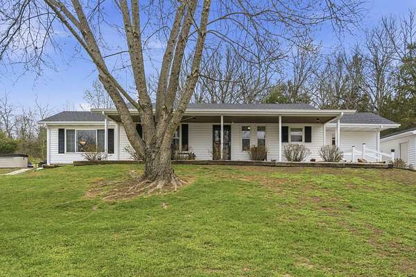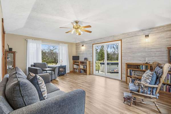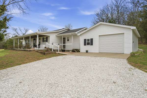 Move-in ready ranch home on 3.78 acres offering the perfect blend of comfort, privacy, and space to enjoy the outdoors. Featuring NEW architectural shingles on the house, garage, & shed (2025), Trane HVAC (2026) , garage door, and newer windows on the front, this thoughtfully updated 3 bedroom, 1.5 bath home welcomes you with a large covered front porch and a warm, inviting living room featuring a wood burning stove, LVP flooring, and French doors leading to a bright and spacious sunroom that serves as a second living area. The open flow continues into the eat-in kitchen showcasing white soft close cabinetry, granite countertops, tile backsplash, and stainless appliances that all stay with the home. The primary bedroom includes a private en-suite half bath, while two additional bedrooms share a full hall bathroom. A generous laundry area offers extra storage, includes the washer/dryer, and the oversized garage provides ample room for a workbench and additional storage despite having a single door. Step outside from the sunroom to a patio with a hot tub that conveys, creating the perfect place to relax and take in the peaceful setting. The property features a park-like atmosphere with mature surroundings, a storage shed, and three raised garden beds already producing strawberries, raspberries, and an apple tree. Located on a corner lot in a quiet rural setting, this property offers privacy, frequent wildlife sightings including deer, and the opportunity to enjoy true country living while still having modern updates such as the new roof, HVAC, LVP flooring, gutters, downspouts, and leaf guards already in place.