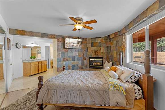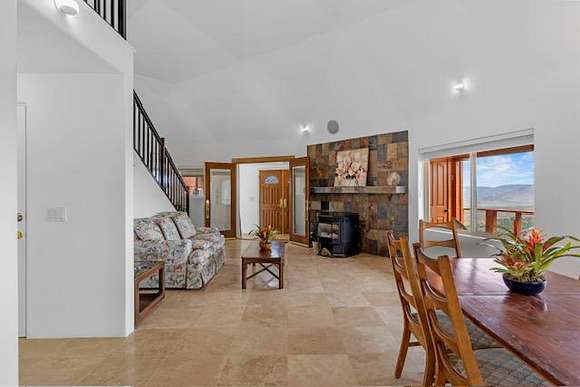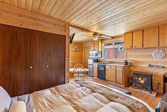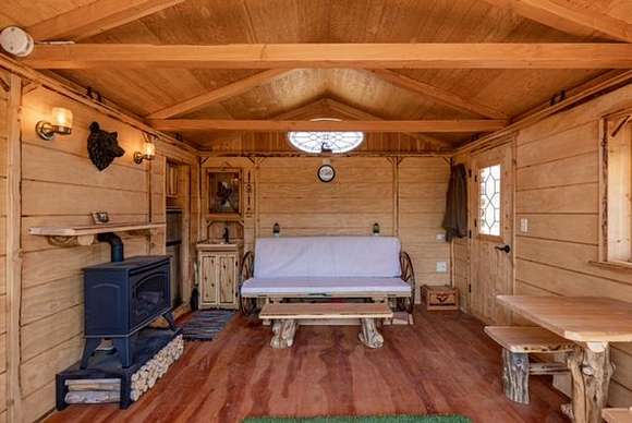 A 2960 sq ft garage has a large 2nd level storage area, is large enough to house a tractor, 4 cars and a workshop with a wood burning fireplace, electric car charging station, a second laundry area and a log cabin style studio apartment that is also being used as a short term rental.