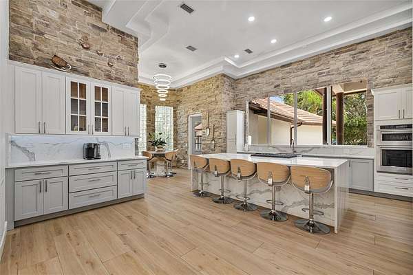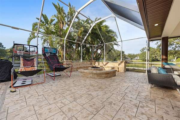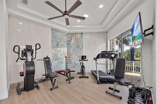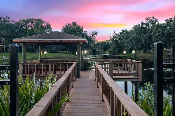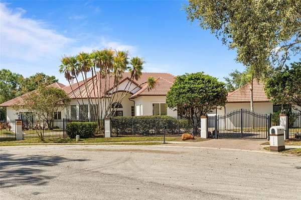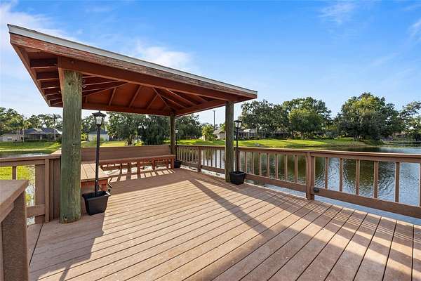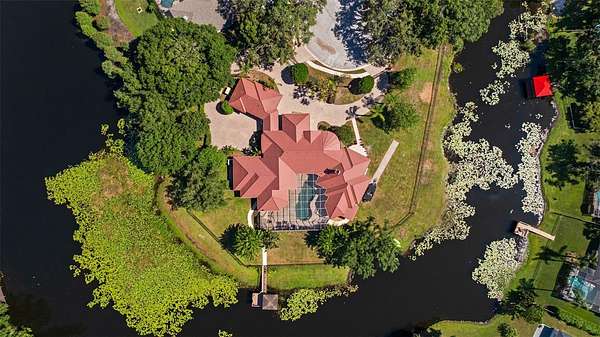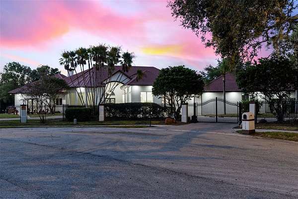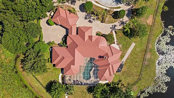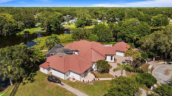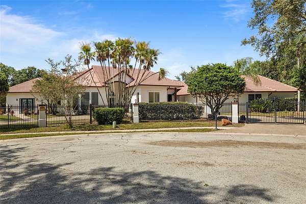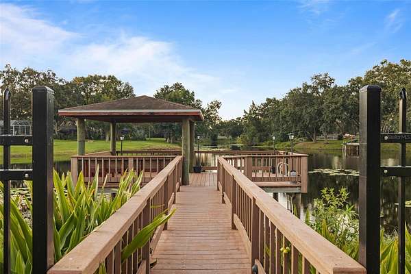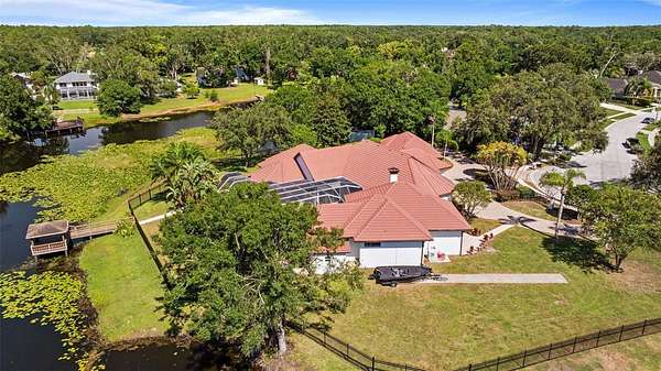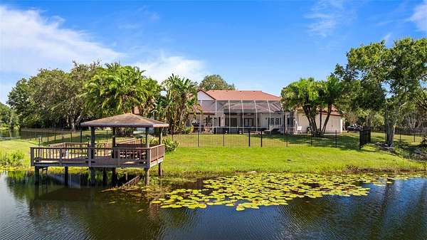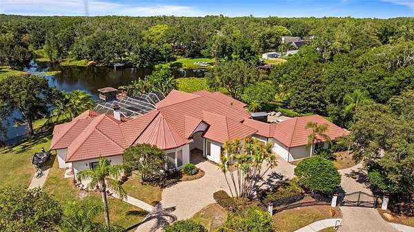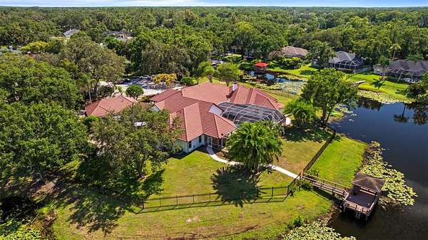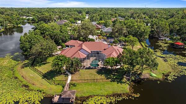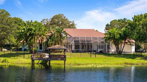 PRICE IMPROVEMENT! Welcome to Tiffany Lake Manors, where luxury living meets serene waterfront bliss. This newly modernized, lakefront estate offers 4 bedrooms, 3.5 bathrooms, a 3-car garage with a dedicated workshop, and an expansive 5,220 sq. ft. of elegant living space all situated on a private 2.5-acre gated lot with 180? unobstructed water views. Step through your custom double-entry impact glass doors into a home designed to impress, featuring wood-look porcelain tile throughout and thoughtfully curated high-end finishes. The chef's kitchen boasts a 6-burner gas cooktop, quartz waterfall countertops, KitchenAid appliances, a built-in refrigerator, undermount farmhouse sink, coffee bar, and walk-in pantry with space for a second refrigerator. Stone accent walls and abundant natural light create a perfect blend of rustic elegance and modern design.The primary suite is your personal sanctuary, with a private sitting area, two massive walk-in closets with islands, LED lighting, and a spa-inspired en-suite featuring a freestanding slipper tub, dual rainfall shower heads, multiple body jets, and touch-activated brass fixtures. Adjacent is a dedicated home gym overlooking the lake for the ultimate in wellness convenience. Multiple entertaining spaces include a family room, a separate living room with vaulted ceilings and a sleek modern fireplace. At the back of the living room is a wet bar that opens to the resort-style screened pool area. Outdoors, enjoy your screened in heated saltwater pool with brick paver decking, a fire pit lounge area, and a covered lanai - all overlooking your private dock on a kayak and fishing-friendly lake. The secondary bedrooms offer privacy and comfort -- including a guest suite with a private bathroom and additional bedrooms sharing a stylish Jack-and-Jill bath, all with rainfall showers, vessel sinks, and high-end fixtures. All bathrooms feature touchless ANZZI bidet toilets with advanced features. Additional highlights include: New A/C (2023) & all-new ductwork (2020), Impact glass block architectural accents, Fully fenced and gated property, Smart home touch-activated faucets throughout, Generac home generator. This showpiece home offers resort-style living with privacy, luxury, and unmatched lake views while still offering easy access to Downtown Tampa and all it has to offer. Don't miss your opportunity to own this one-of-a-kind Florida estate!