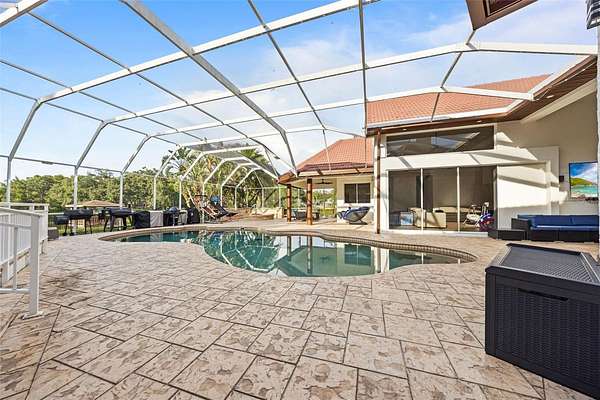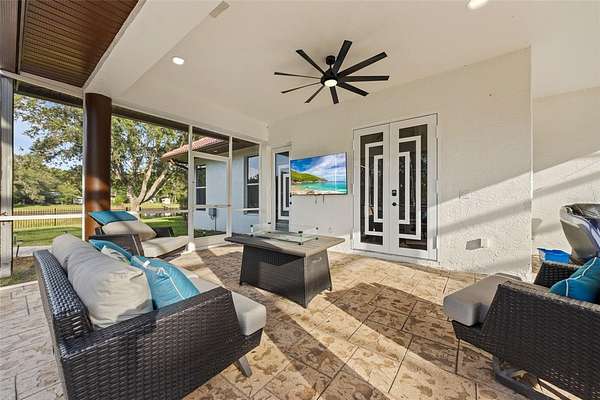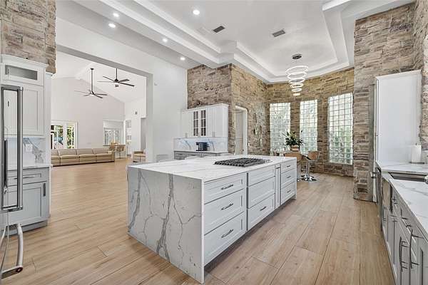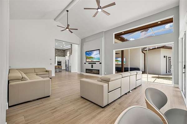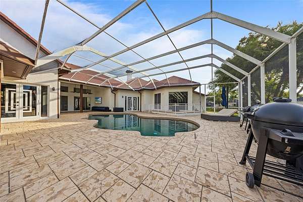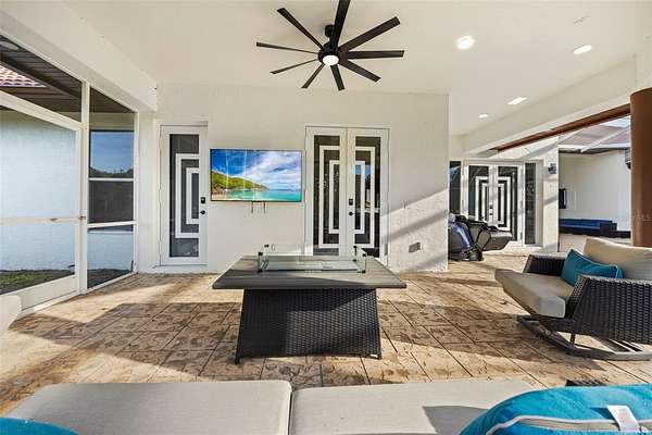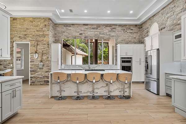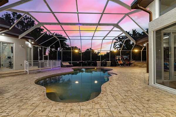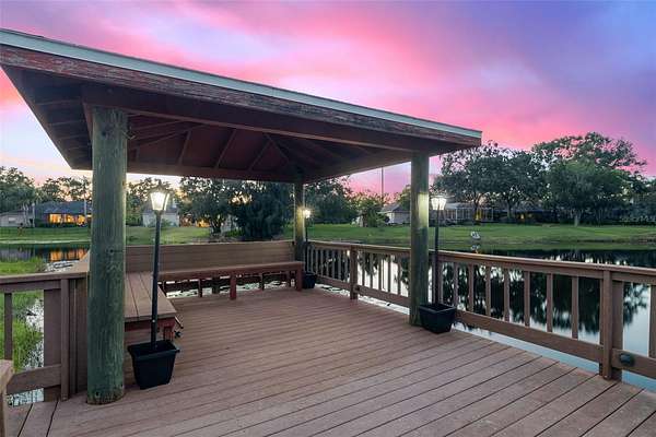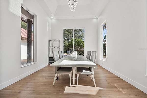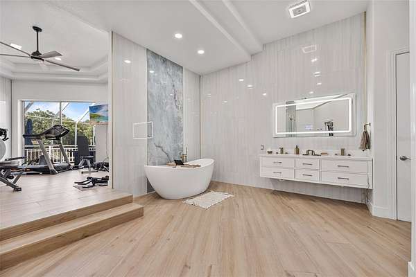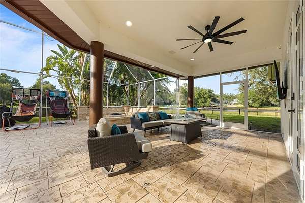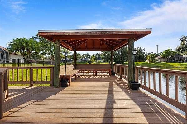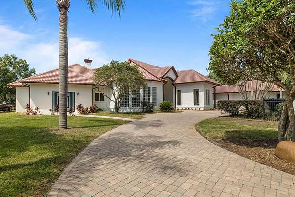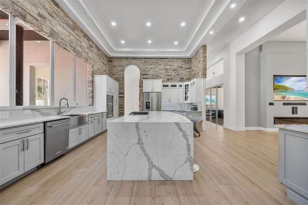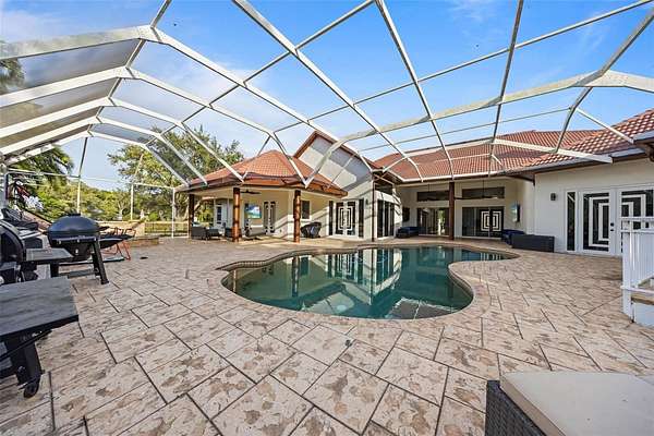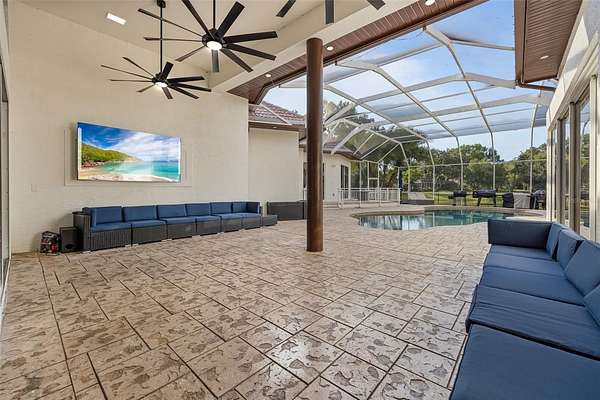PRICE IMPROVEMENT! Welcome to Tiffany Lake Manors, where luxury living meets serene waterfront bliss. This newly modernized, lakefront estate offers 4 bedrooms, 3.5 bathrooms, a 3-car garage with a dedicated workshop, and an expansive 5,220 sq. ft. of elegant living space all situated on a private 2.5-acre gated lot with 180? unobstructed water views. Step through your custom double-entry impact glass doors into a home designed to impress, featuring wood-look porcelain tile throughout and thoughtfully curated high-end finishes. The chef's kitchen boasts a 6-burner gas cooktop, quartz waterfall countertops, KitchenAid appliances, a built-in refrigerator, undermount farmhouse sink, coffee bar, and walk-in pantry with space for a second refrigerator. Stone accent walls and abundant natural light create a perfect blend of rustic elegance and modern design.The primary suite is your personal sanctuary, with a private sitting area, two massive walk-in closets with islands, LED lighting, and a spa-inspired en-suite featuring a freestanding slipper tub, dual rainfall shower heads, multiple body jets, and touch-activated brass fixtures. Adjacent is a dedicated home gym overlooking the lake for the ultimate in wellness convenience. Multiple entertaining spaces include a family room, a separate living room with vaulted ceilings and a sleek modern fireplace. At the back of the living room is a wet bar that opens to the resort-style screened pool area. Outdoors, enjoy your screened in heated saltwater pool with brick paver decking, a fire pit lounge area, and a covered lanai - all overlooking your private dock on a kayak and fishing-friendly lake. The secondary bedrooms offer privacy and comfort -- including a guest suite with a private bathroom and additional bedrooms sharing a stylish Jack-and-Jill bath, all with rainfall showers, vessel sinks, and high-end fixtures. All bathrooms feature touchless ANZZI bidet toilets with advanced features. Additional highlights include: New A/C (2023) & all-new ductwork (2020), Impact glass block architectural accents, Fully fenced and gated property, Smart home touch-activated faucets throughout, Generac home generator. This showpiece home offers resort-style living with privacy, luxury, and unmatched lake views while still offering easy access to Downtown Tampa and all it has to offer. Don't miss your opportunity to own this one-of-a-kind Florida estate!