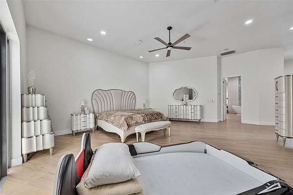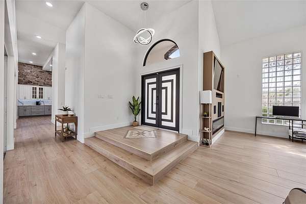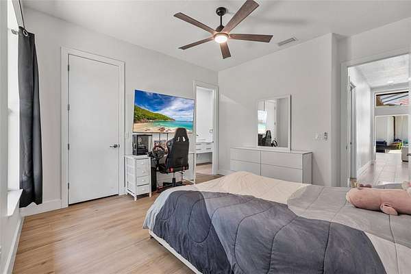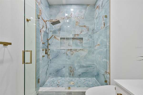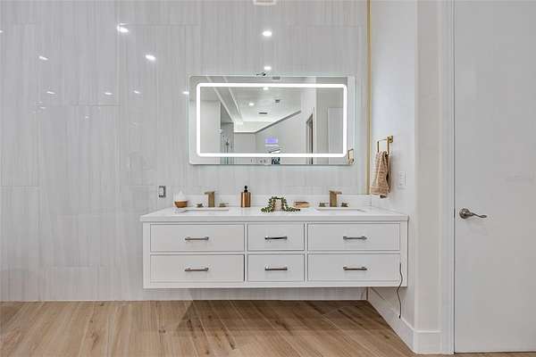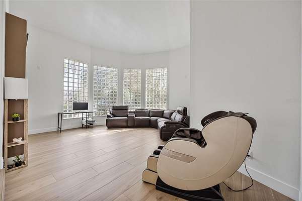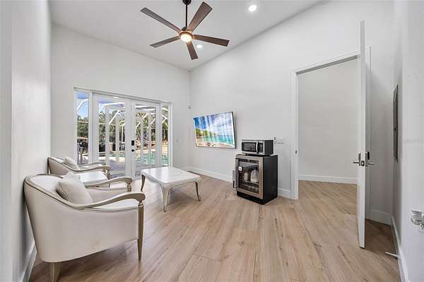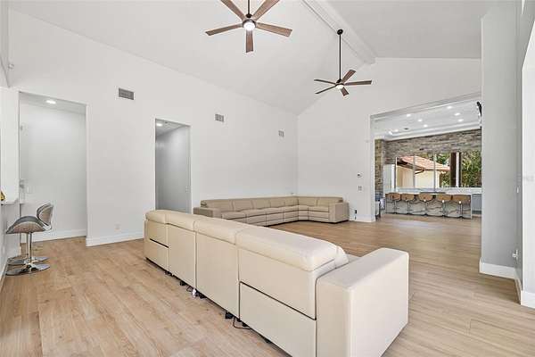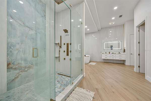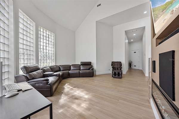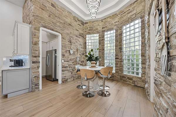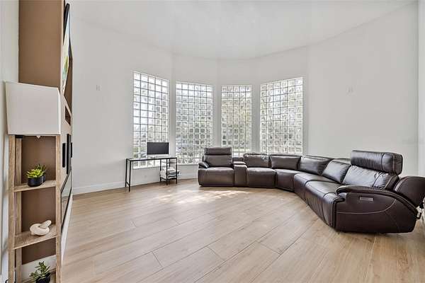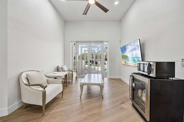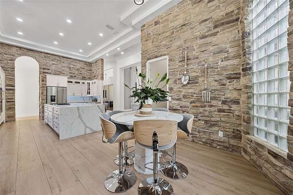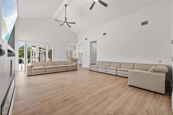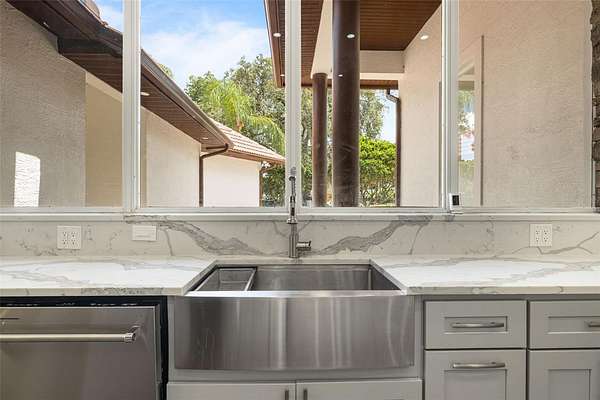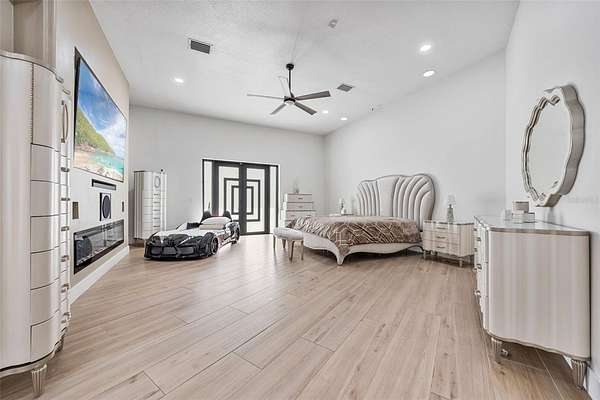 PRICE IMPROVEMENT! Welcome to Tiffany Lake Manors, where luxury living meets serene waterfront bliss. This newly modernized, lakefront estate offers 4 bedrooms, 3.5 bathrooms, a 3-car garage with a dedicated workshop, and an expansive 5,220 sq. ft. of elegant living space all situated on a private 2.5-acre gated lot with 180? unobstructed water views. Step through your custom double-entry impact glass doors into a home designed to impress, featuring wood-look porcelain tile throughout and thoughtfully curated high-end finishes. The chef's kitchen boasts a 6-burner gas cooktop, quartz waterfall countertops, KitchenAid appliances, a built-in refrigerator, undermount farmhouse sink, coffee bar, and walk-in pantry with space for a second refrigerator. Stone accent walls and abundant natural light create a perfect blend of rustic elegance and modern design.The primary suite is your personal sanctuary, with a private sitting area, two massive walk-in closets with islands, LED lighting, and a spa-inspired en-suite featuring a freestanding slipper tub, dual rainfall shower heads, multiple body jets, and touch-activated brass fixtures. Adjacent is a dedicated home gym overlooking the lake for the ultimate in wellness convenience. Multiple entertaining spaces include a family room, a separate living room with vaulted ceilings and a sleek modern fireplace. At the back of the living room is a wet bar that opens to the resort-style screened pool area. Outdoors, enjoy your screened in heated saltwater pool with brick paver decking, a fire pit lounge area, and a covered lanai - all overlooking your private dock on a kayak and fishing-friendly lake. The secondary bedrooms offer privacy and comfort -- including a guest suite with a private bathroom and additional bedrooms sharing a stylish Jack-and-Jill bath, all with rainfall showers, vessel sinks, and high-end fixtures. All bathrooms feature touchless ANZZI bidet toilets with advanced features. Additional highlights include: New A/C (2023) & all-new ductwork (2020), Impact glass block architectural accents, Fully fenced and gated property, Smart home touch-activated faucets throughout, Generac home generator. This showpiece home offers resort-style living with privacy, luxury, and unmatched lake views while still offering easy access to Downtown Tampa and all it has to offer. Don't miss your opportunity to own this one-of-a-kind Florida estate!