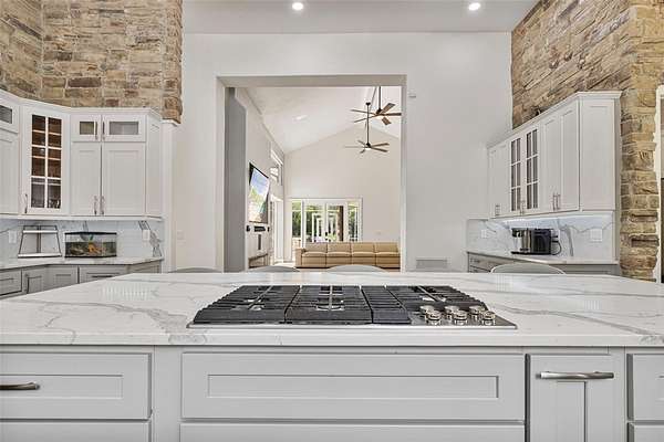 - Built-In Features, Cathedral Ceiling(s), Ceiling Fans(s), Eat-In Kitchen, High Ceilings, Kitchen/Family Room Combo, Open Floorplan, Primary Bedroom Main Floor, Solid Surface Counters, Solid Wood Cabinets, Split Bedroom, Stone Counters, Thermostat, Walk-In Closet(s), Wet Bar