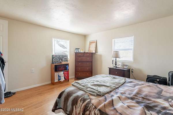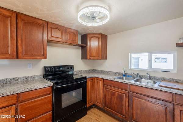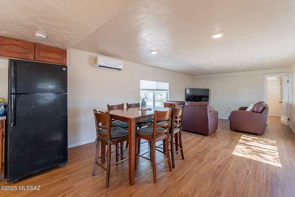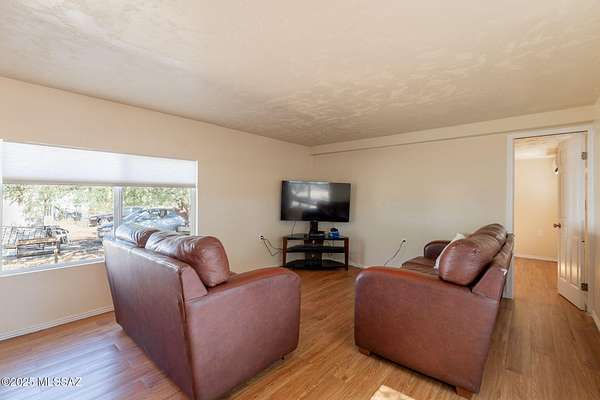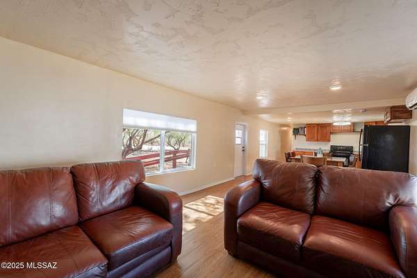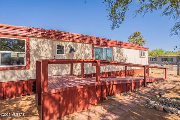 Well-kept 3-bedroom, 2-bath manufactured home located on leasehold land in the quiet Santa Rita Heights Mobile Home Park. This home features a split floorplan with a spacious living area and plenty of natural light. The kitchen offers ample cabinet space and connects to the dining area for easy everyday living. The primary suite includes its own en suite bathroom, and all bedrooms are well-sized. Outside, enjoy a low-maintenance yard with mature desert landscaping, mountain views, and a ramp leading to the front door for added accessibility. Parking includes a dedicated space on the north side and a driveway that fits multiple vehicles. Come see the potential! Sold As Is. Approval from mobile home park required before finalizing purchase.