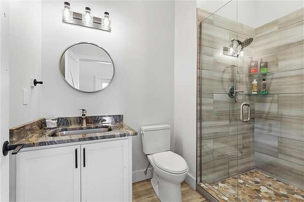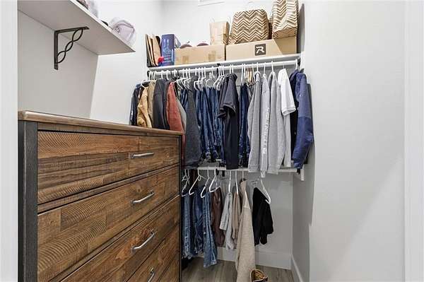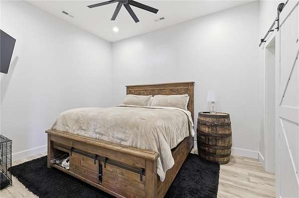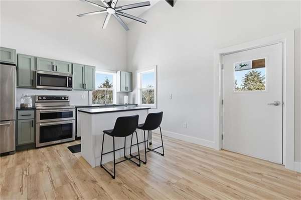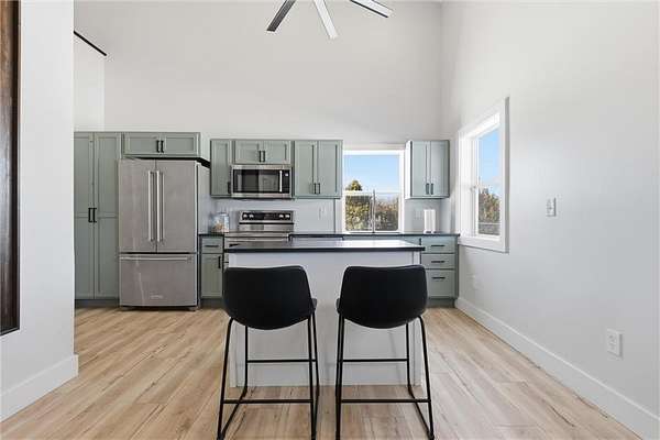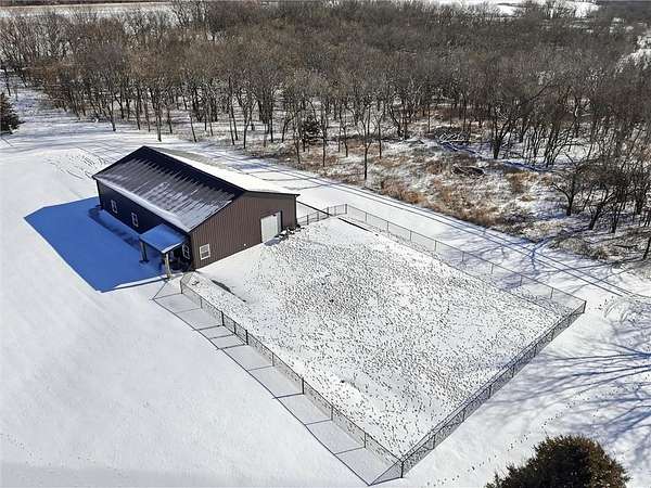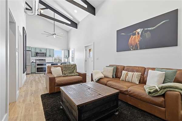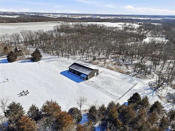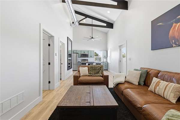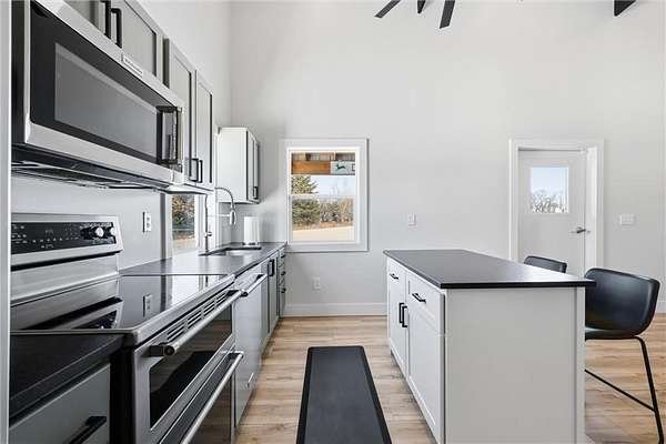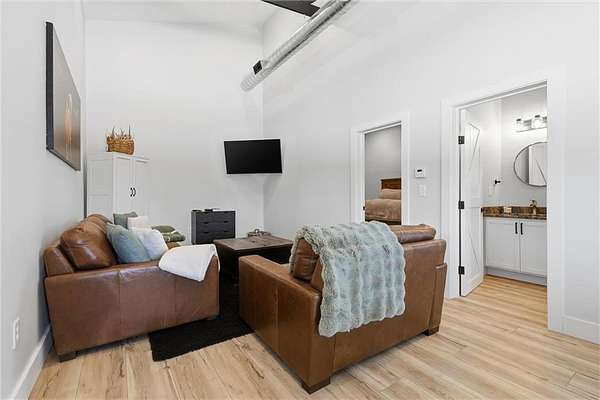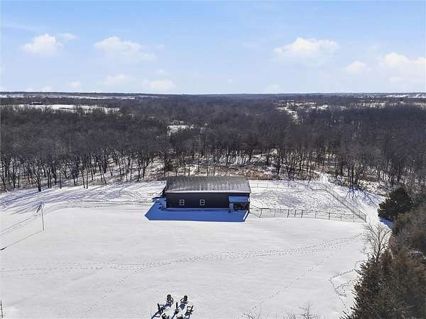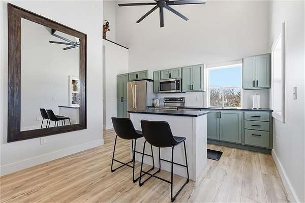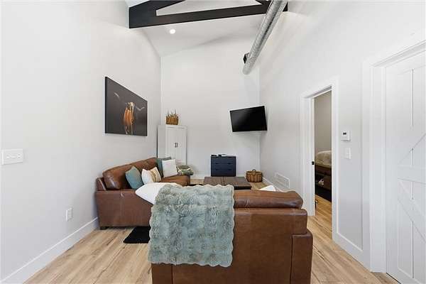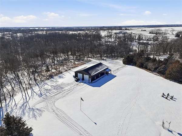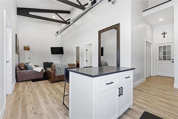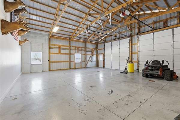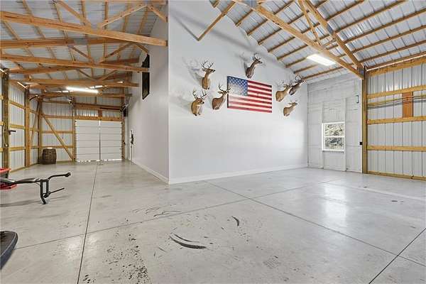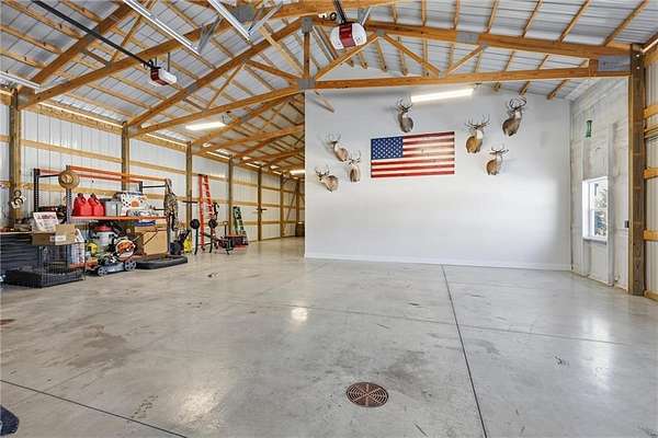 Tucked away on 34.16 acres in Peculiar, MO, this unique property features a 1-bedroom, 1-bath living quarters built inside a pole barn, offering the perfect blend of outdoor lifestyle and modern comfort. Ideal as a weekend retreat, hunting getaway, or future homesite with existing improvements already in place. The living space features LVP flooring throughout for easy maintenance, a vaulted ceiling that creates an open, spacious feel, and exposed beams and ductwork for a clean industrial aesthetic. The kitchen includes a island for seating, stainless steel appliances, granite countertops, and painted cabinetry. The bathroom offers a tiled walk-in shower with glass door, and the bedroom includes a walk-in closet. The remaining barn space functions as a versatile garage and storage area with three overhead doors, allowing for pull-through access, perfect for equipment, off-road vehicles, or recreational gear. Additional features include a large blacktop driveway and a fenced area suitable for pets or outdoor use. The property includes a stocked, approximately one-acre pond with feeder, electric and water already run to the barn, and a gravel drive leading back to the structure, set privately on the acreage. A treed section with trails leads to a deer blind and feeders, making this an excellent setup for outdoor enthusiasts. See Land listing MLS # 2598578