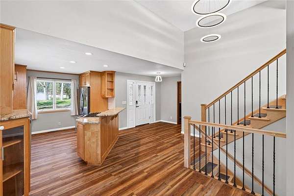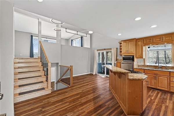 Set on 2 scenic acres with sweeping views of open land and nature, this home blends space, comfort, and functionality. The open-concept kitchen features maple cabinetry, stainless steel appliances, granite countertops, and a center island with a gas cooktop, flowing into a bright dining area ideal for everyday living and entertaining.