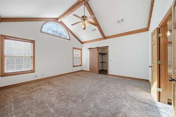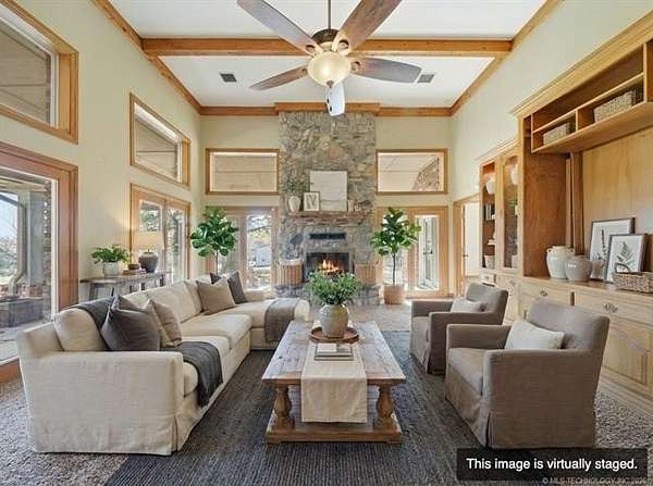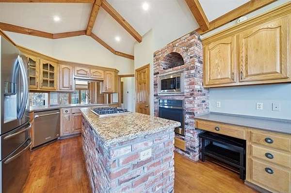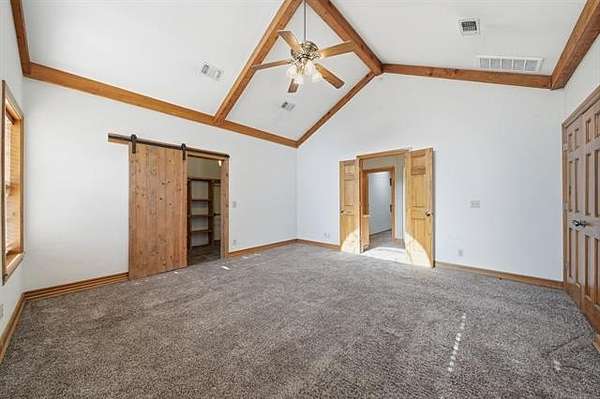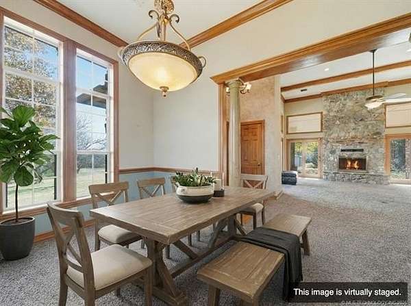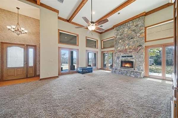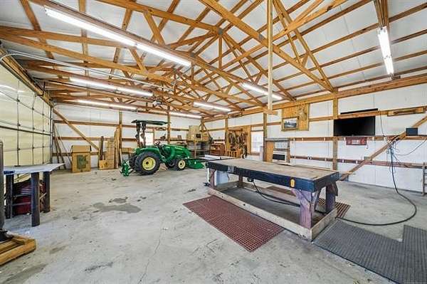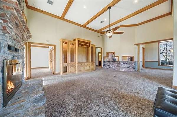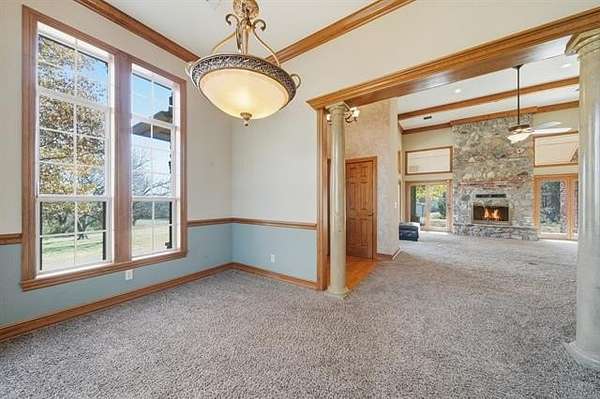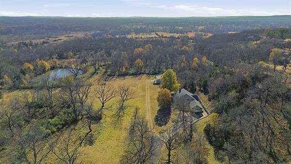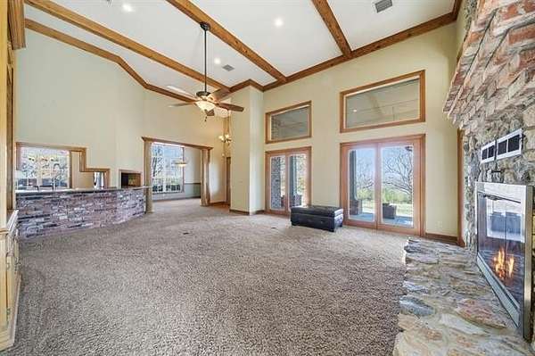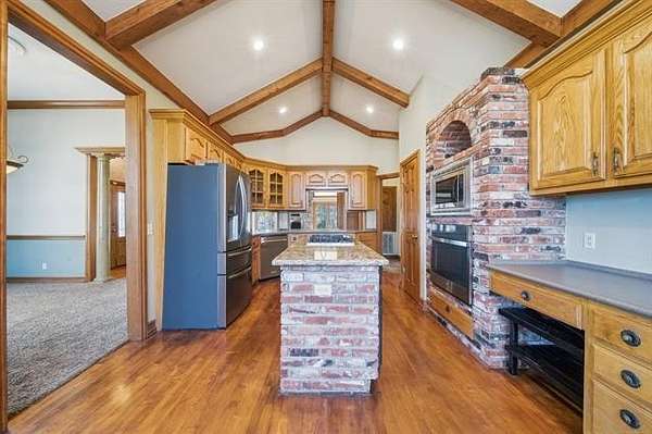 Welcome to your own private retreat custom built home on 3.3 acres m/l (Court House) with views and all within minutes to all you need. Crown molding throughout and wood beams. 14ft foot ceilings in the family, primary bedroom and kitchen. The family room has windows all around to take in the views and the focal point is the floor to ceiling stone, wood burning fireplace featuring gas starter and blower. Kitchen has an island with storage and brick detail, gas cooktop, stainless steel appliances, wood floors and a sunny eat-in breakfast nook in front of a large window. Large formal dining room. Primary bedroom has two closets, vaulted ceilings and can accommodate king size furniture. The primary in suite bathroom has separate vanities, whirlpool tub, walk in shower and closet that is also a safe room. Split bedroom plan has two additional bedrooms with walk in closets and a full hall bath to service. From the two car side entry garage you enter into the large tiled mudroom or sunroom. The 20x40 metal shop is perfect for all your hobbies and toys, with an electric overhead door, heat and air. Near Woodland Park and Kiddy Lake. Roof is 6 years old, Trane heat/ Air new Sept. 2022, dishwasher new 2022, oven new 2024, water heater new 2022. This is a beautiful home and you will spend your time on the large covered porch enjoying the views and sunsets.