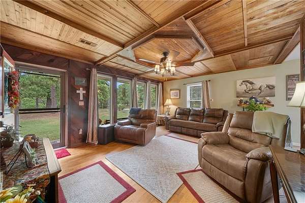 LIVE YOUR BEST LIFE ON THIS BEAUTIFUL 6.87 ACRES. SELLER IS OFFERING 10,000 TOWARD BUYERS CLOSING COST, PRICE REDUCTION OR PERSONAL PROPERTY PURCHASE. This well maintained home has energy efficient windows, detached garage, barn, and a full RV hookup with septic and 30 & 50 Amp. Sit on the back deck and watch the kids in play in the fenced back yard. Beautiful Sunrise and Sunsets and wildlife are Abundant. Bring your Chickens as there is a coop already built. Warm your soul with a cup of coffee by the pellet stove inside with a great cedar lined living room and a very functional kitchen. Office space just off the primary bedroom. COME MAKE YOUR HOME IN PEA RIDGE ARKANSAS