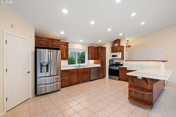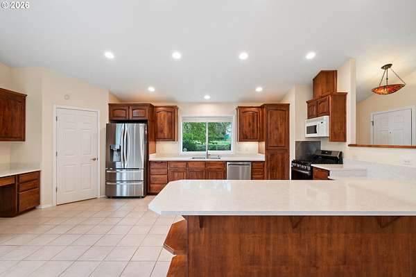 - Dishwasher, Free Standing Gas Range, Free Standing Refrigerator, Microwave, Pantry, Plumbed For Ice Maker, Quartz, Stainless Steel Appliance, Tile