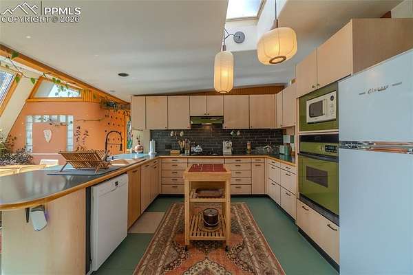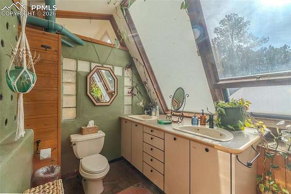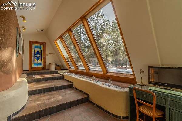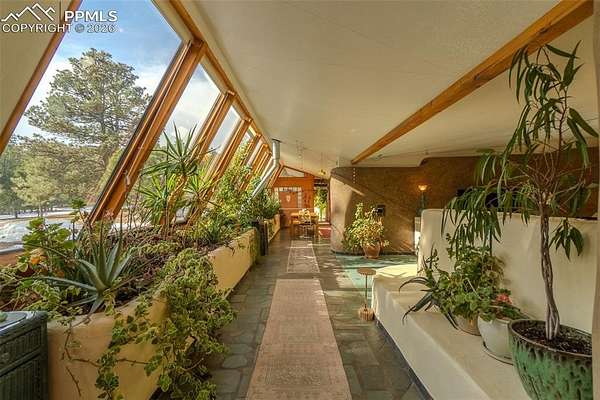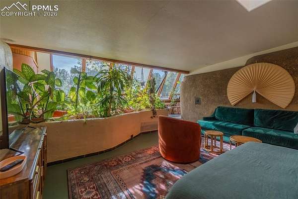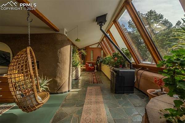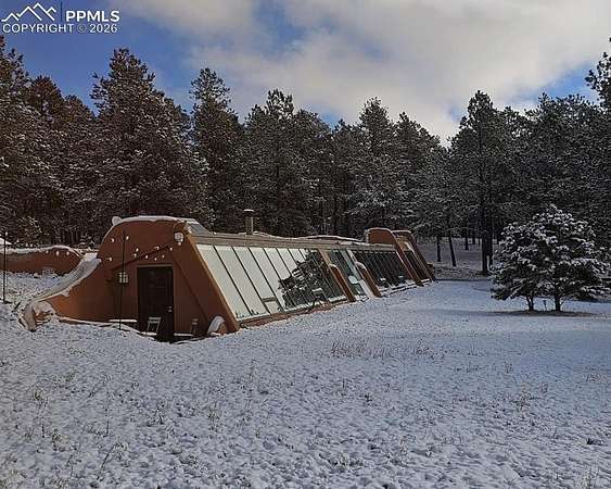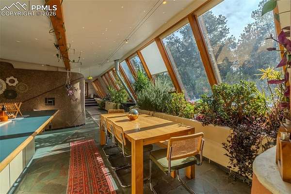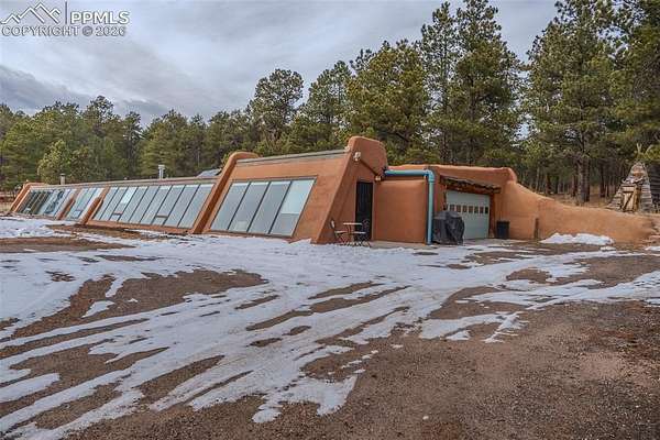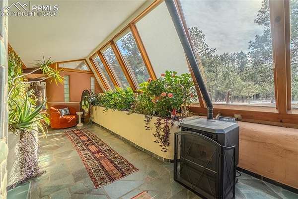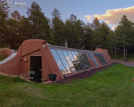 An exceptional, rare Earthship retreat awaits in the heart of Black Forest. Nestled among trees this off-grid, solar-passive home on 5 private, peaceful acres offers a self-sustaining lifestyle without sacrificing comfort or modern convenience. With over 2,900 sq ft on a single level, the home is thoughtfully designed to maintain a comfortable climate year around while being completely independent from public utilities. A dramatic 100-foot wall of windows anchors the front of the home, flooding the expansive interior with natural light. An indoor pond and wall of built-in planters complete with drip irrigation bring nature seamlessly indoors. The spacious kitchen is a standout, featuring abundant cabinetry, a generous walk-in pantry, slate backsplash, extensive counter space, brand new propane powered refrigerator and large dining space. Energy efficient with fully owned new solar system, an automatic propane generator, on-demand tankless water heater, and 2 heating options; cozy gas-burning stove and a brand new pellet stove. Utility costs remain impressively low. High-speed fiber optic internet, offering lightning-fast connectivity even in this serene, rural setting. The bathroom is both functional and artistic; large windows, a deep tub, double vanity, a stained-glass door, and a wall of embedded glass bottles that cast beautiful, colorful light in the space. The great room invites relaxation with large seating area, abundant sunlight, and sweeping views of the property. The primary suite is a retreat with walk-out access to the side patio, planters, a comfortable sitting area, and a walk-in closet. A flexible guest room offers a cozy recessed bed and a built-in planter wall that provides privacy and character. Additional highlights include an attached 2-car garage, a domestic well with a 500-gallon storage cistern and dedicated solar panels, an outbuilding, and land suitable for horses, animals, or RVs. With no HOA, the property offers freedom and versatility.