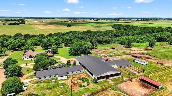 Price to SELL! Turnkey horse property on 55.41 acres located in Collinsville, TX, in the heart of Horse Country USA. This professionally maintained equestrian estate offers multiple homes, extensive horse facilities, and a private, functional layout ideal for any horse operation. The main home is 3,967 square feet and was fully remodeled six years ago, with additional updates in 2024 including new windows and roof. The residence includes 3 bedrooms, 3 full bathrooms, a half bath, an updated kitchen, spacious living areas, and a large backyard with pool, patio, and separate pool house with a full bath and living area. Horse facilities include a 70x120 covered riding arena, LARGE outdoor arena, and two barns offering a total of 24 stalls. The show barn features 14 stalls, 2 tack rooms, and an office. The mare barn offers 11 stalls with 5 turnouts. The property also includes a 38x60 shop, 12x38 hay storage, multiple paddocks, fenced and cross-fenced pastures, and ample trailer parking. Three ponds, gated entrances, and well-planned infrastructure make this a fully operational property. Additional living spaces include an updated apartment attached to the barn, a 1396 square foot, 3-bedroom, 1-bathroom home at the front of the property with a separate gated entrance, and an optional tiny home that can be included for expanded living or guest accommodations. This rare offering provides a complete setup for horses, ranch operations, and multi-generational or staff housing. Located in a peaceful and highly sought-after area with easy access to major equine facilities, this property is ready for immediate use and future expansion. Seller would split up and divide. See MLS #21155496 for ranch with 38.34.