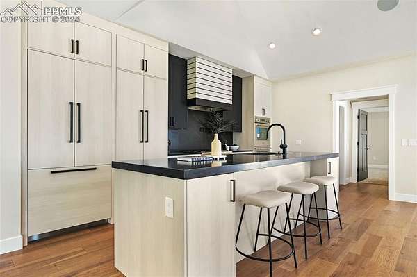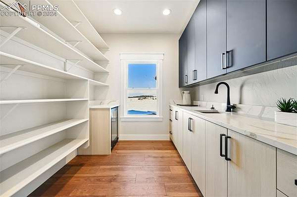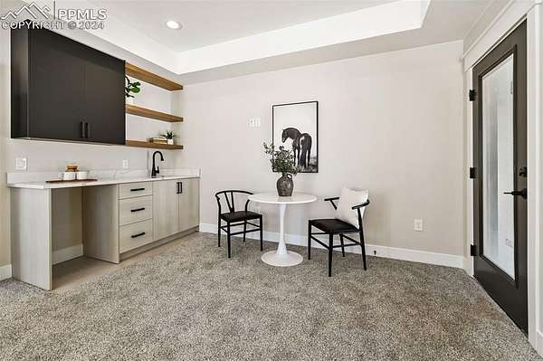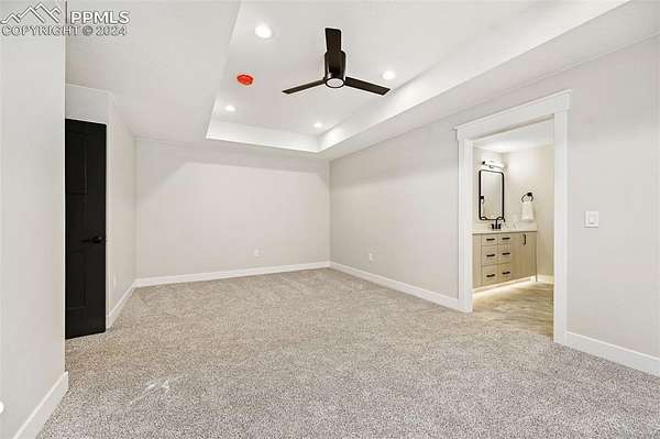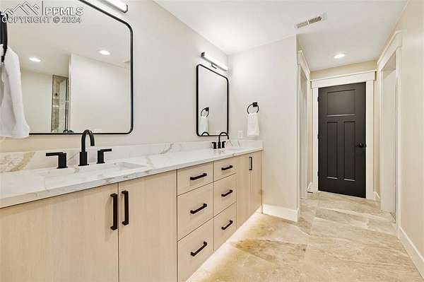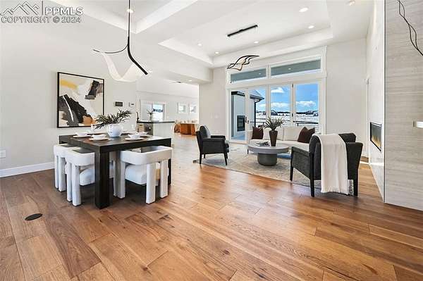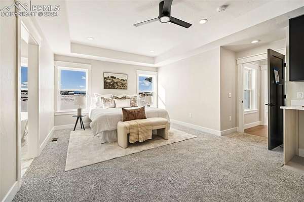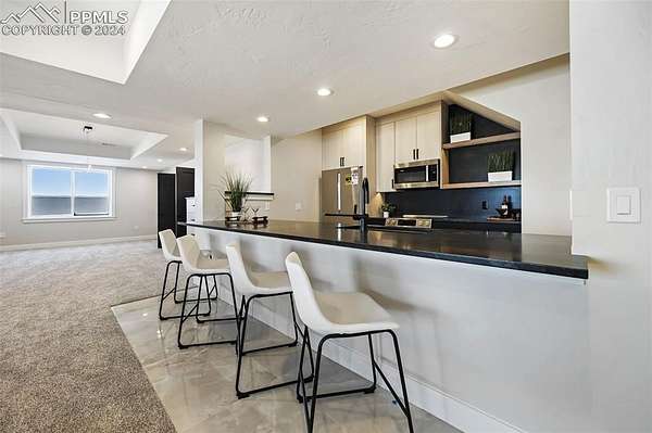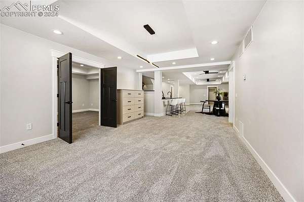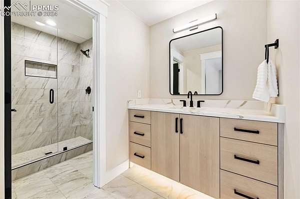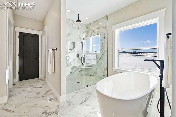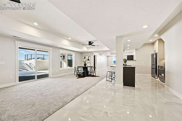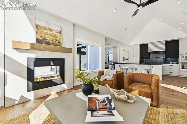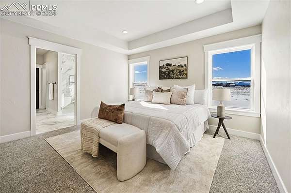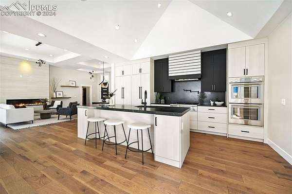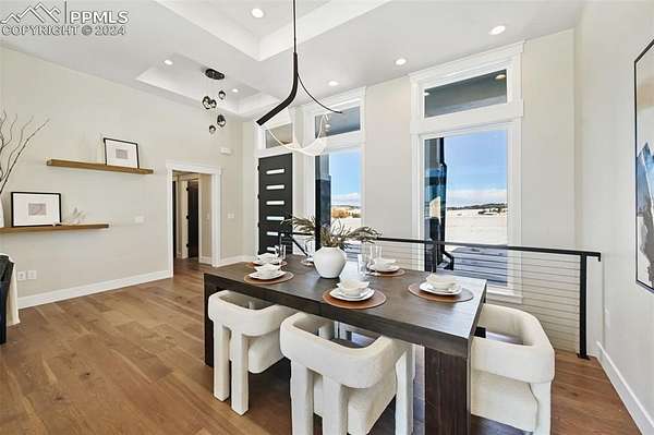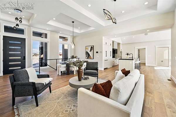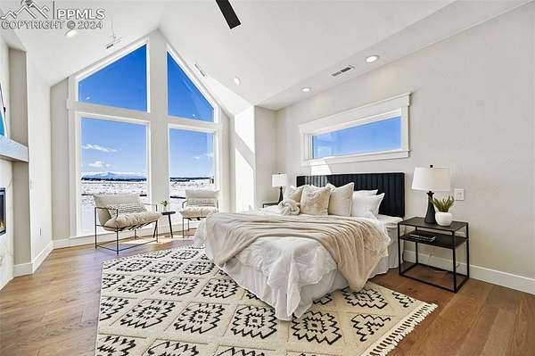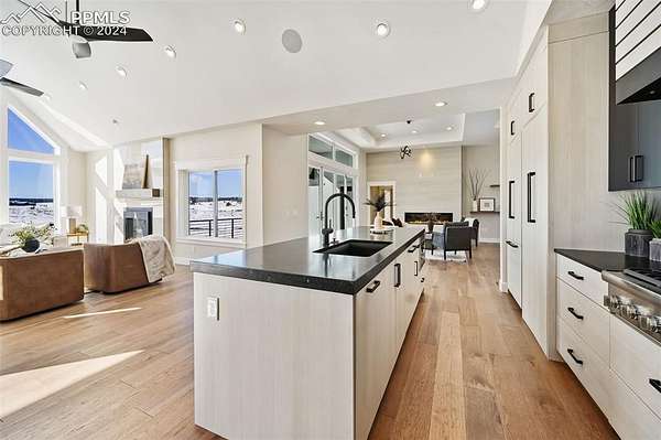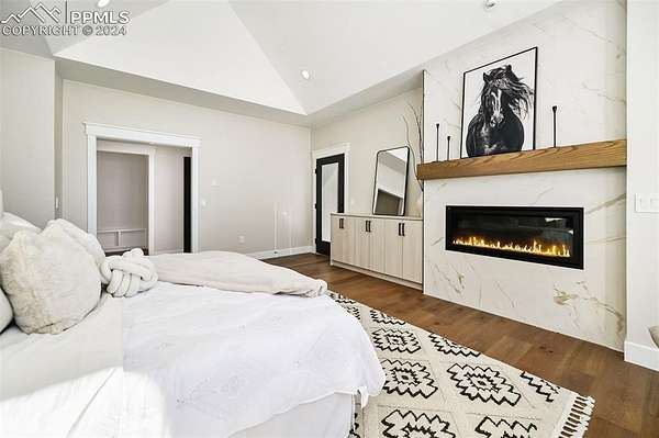 Welcome to your dream home at the end of a serene cul-de-sac in the Winsome community! Nestled on an expansive 5.28-acre lot, this property offers a rare combination of tranquility and luxury, with zoning that allows for two horses. As you step inside, you'll immediately feel the warmth and charm of the cozy hearth room, which boasts breathtaking views of Pikes Peak and a welcoming fireplace. This versatile space can double as a formal dining room and seamlessly opens to the back deck, ideal for indoor-outdoor living. The chef's kitchen is a culinary masterpiece, featuring a hidden pantry, a large island, double ovens, and a gas cooktop. It's the perfect setting for crafting gourmet meals while enjoying panoramic views. Retreat to the master suite, where vaulted ceilings and a second fireplace create a luxurious ambiance. The master bedroom also offers stunning Pikes Peak views and direct access to the back deck. The adjoining spa bath is a sanctuary of relaxation, with two master closets, a zero-entry shower, and a soaking tub. Convenience meets luxury with the bath connected to the laundry room. For guests, the main level includes a secondary junior suite with its own private entrance, offering a perfect space for extended stays. The lower level is an entertainer's paradise, featuring a gathering room with a full secondary kitchen, a billiards room, and a theater room. There are also two additional junior suites, each with its own unique touches: one with a double vanity and barn door, the other with a small wet bar ideal for a coffee corner for guests. The property is designed for outdoor enjoyment with multiple decks and patios, including a covered patio that walks out to the beautifully landscaped yard. A vault/safe room provides versatile options-convert it into a wine room or use it for your own creative purposes! Additional features include a convenient mudroom off the oversized 3-car garage, perfect for everyday living.