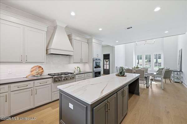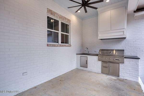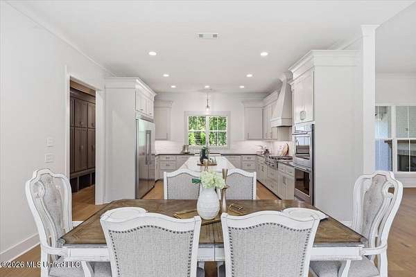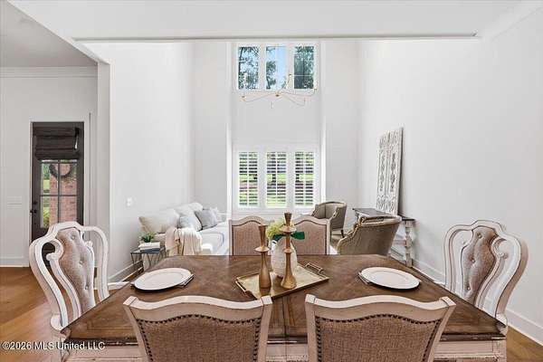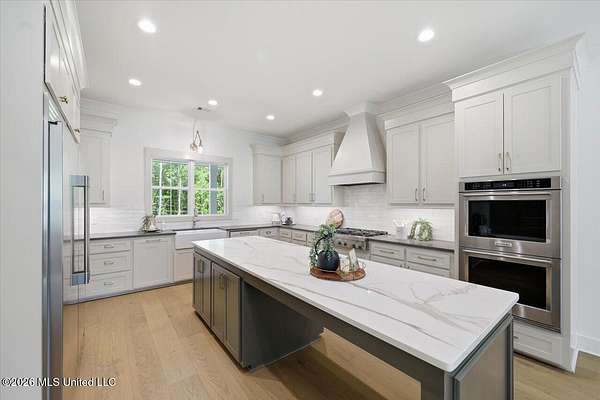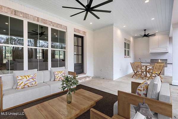 CLICK ON VIRTUAL TOUR: Experience an exquisite home on 2 acres in the heart of Madison the City. This charming residence has a rustic French farmhouse exterior, graced with a covered front porch under a sloped roof. Inside, discover a bright and inviting family room with a real wood burning fireplace. There is also a built-in, copper lined wood bin to keep dry wood available. The keeping room boasts soaring two-story windows with a slanted, shiplapped roof adorned with a chandelier. A huge farmhouse table begs to live in the space between the keeping area and kitchen. The gourmet kitchen is a chef's dream. It includes a generous, eat up-island, Frigidaire Professional Single Door Refrigerator and Freezer, KitchenAid 36'' 6 burner commercial style gas range top, double oven, microwave drawer, ice maker, and picturesque backyard views over farmhouse sink. The ice maker and dishwasher have cabinet fronts to seamlessly blend in with the rest of the shaker style cabinets. A walk-in pantry ensures ample storage for food and various kitchen appliances. The living spaces are perfect for both everyday living and entertaining. The primary suite is a haven of sophistication, featuring soaring ceilings, double vanities, a walk-in shower, a soaker tub with a picture window, and a massive closet with laundry pass-through. That's right, you drop your laundry directly from the primary closet, right into the laundry room. A spacious laundry room and a hallway locker area enhance functionality. Guest suites include two bedrooms sharing a hall bath and a private bedroom suite with a full bath. Upstairs offers more living space, including a full bath a bedroom and an office with closet. Office could be a 6th bedroom, craft room, hobby room, playroom, or man cave! The interior design exudes modern traditional charm, with a neutral color palette and stylish light fixtures. All wood and tile throughout. No carpet. Step outside to the expansive covered back porch, where you can unwind and cook up delights in the fully equipped outdoor kitchen, complete with sink and gas grill, or relax in front of the gas fireplace, all against the backdrop of the enchanting wooded backyard. Spray foam insulaiton in attic. Come see for yourself and take a tour of this beautiful home to fully appreciate the unique features and luxurious living it offers.