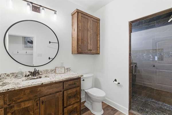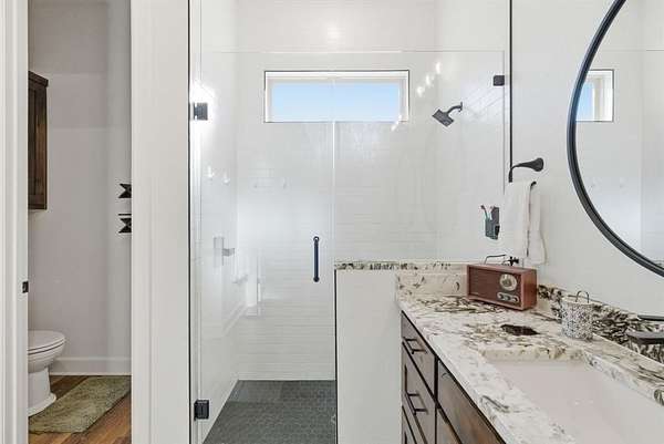 The main level features a private primary suite that speaks luxe and comfort with it's vaulted and beamed ceiling, en suite bath with granite counters, a glass enclosed oversized shower and two generously sized closets for all the things. The rest of the space on the lower level offers a balance of open living area and defined spaces. Upgraded finishes and natural light create a comfortable, easy flow throughout the entire home.