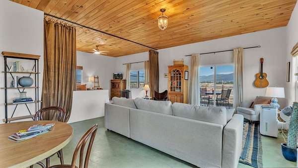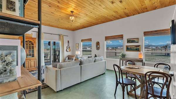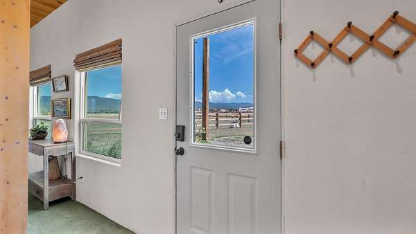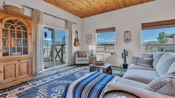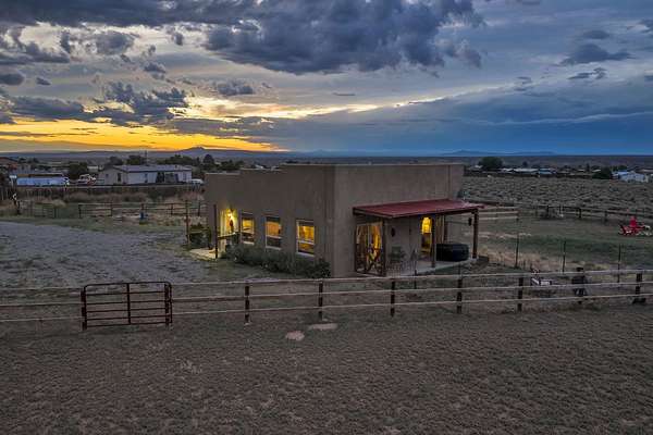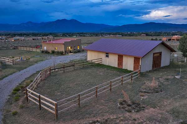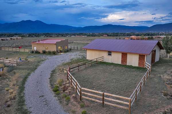 Magical Equestrian Property on the Llano Mesa in Taos ~ Here at 172 West Romero Road strategically perched up on the Llano Mesa, you will experience the perfect equestrian lifestyle at a stunning property, tailor-made for horse lovers and livestock owners. If you like to make some extra income as a short term rental, this residence also has you covered. Situated on 1.59 fenced acres, this unique home and stable offer a harmonious blend of comfortable living and top-tier amenities for you and your animals. The charming pueblo-style house is designed for efficiency and relaxation, with stunning indoor and outdoor views of our mountains and majestic sunsets or sunrises. The floor plan is wide-open with a combined living, kitchen, and sleeping area, along with a full bathroom and laundry space. Included is a cooling and heating mini split for comfort. You'll stay cozy all winter with in-floor radiant heating and passive solar heat from the sun, ensuring a warm and energy-efficient environment. The impressive 34x48 barn, constructed a few years ago with thoroughbreds in mind, is the centerpiece of this equestrian haven. It features six 12x12 stalls that can be easily converted to 12x24, each with exterior dutch doors leading to private turnouts. The barn also includes a dedicated tack room, a wash stall, and a spacious hay loft. The thoughtfully designed grounds include a 132x66 sand arena and four separate paddocks, all enclosed by secure stockade and 3-rail wooden fencing. With the entire property perimeter fenced and gated, your animals have ample space to roam freely and safely. Even the wildlife love this property as you might experience frequent bluebirds, hummingbirds, and foxes hanging out under an occasional dreamy double rainbow. This property minutes from Central Taos, and a close proximity to nature, is a one-of-a-kind find for both you and your animals under the big New Mexico sky.