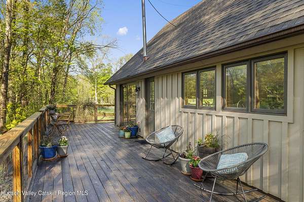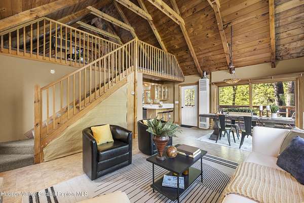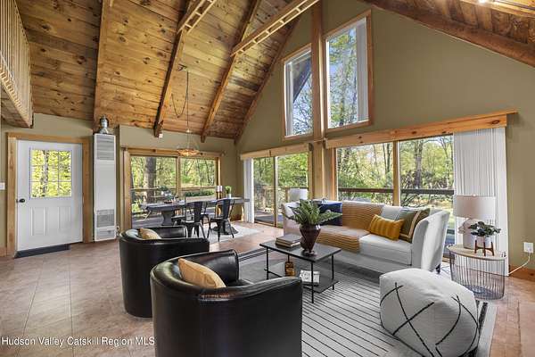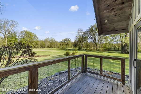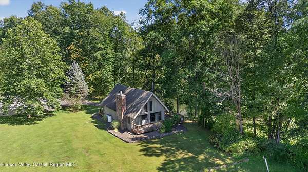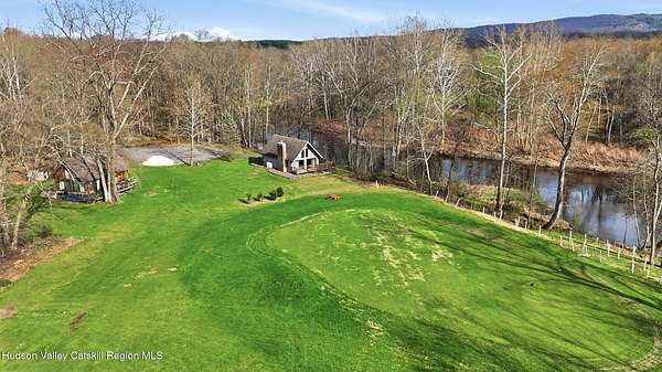 Waterfront and on a golf course! Just 90 minutes from Metro NY, this two-bedroom chalet style home with 2.3 acres and expansive frontage on the Rondout Creek is also sited on the 7th green and at the end of a cul-de-sac. The wrap around deck allows for seasonal dining and enjoyment of the outdoors, including sunsets and the lovely creek. The great room includes a generous sized living room and dining area with floor to ceiling windows, vaulted ceiling and stone fireplace with propane stove insert. Smartly designed kitchen with new quartz countertops and sink, ample cabinets and pantry. Truly a bird watcher's paradise, there is a view from almost every window - either the creek for wildlife or the bright green golf course! Any anglers in your group? Bring your fishing pole to take advantage of the direct Rondout Creek frontage and hook a nice small mouth bass. The main floor bedroom is well-sized with two closets and adjacent full bath. The second story sleeping loft also has a vaulted ceiling and is open to the common space. The 14X8 storage shed is great for your belongings and two kayaks are included in the sale! Take advantage of this rare opportunity to make your own memories in a home that is ready for a new chapter, having been cherished by the same family for decades. So well located - just two minutes to High Falls for Ollie's Pizza, Blue Heron Books and vintage shopping. Ten minutes to Mohonk Preserve's Spring Farm Trailhead, 20 minutes to Kingston and New Paltz for easy access to the NYS Thruway and all the area has to offer. Enjoy our local venues such as Innes for world class dining and spa, Arrowood for local cider and spirits, Kelder's Farm to pick fresh produce and join the Stone Dock Golf Course for a great nine holes of golf. For either full or part time use, this location and house is a true gem.