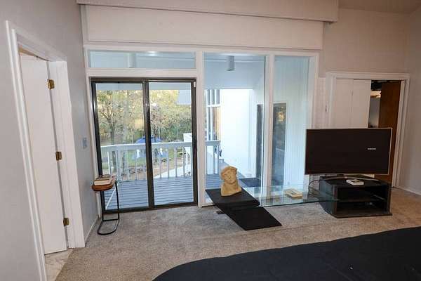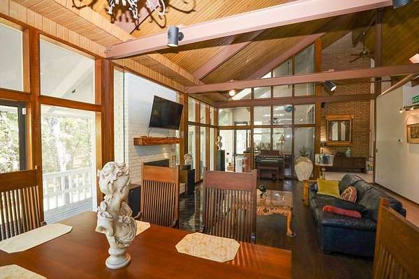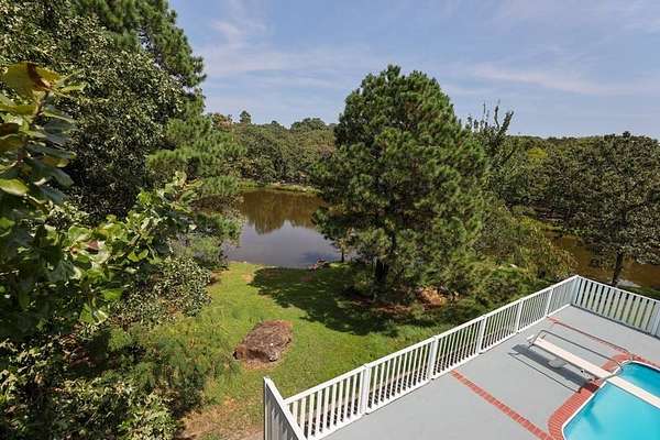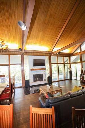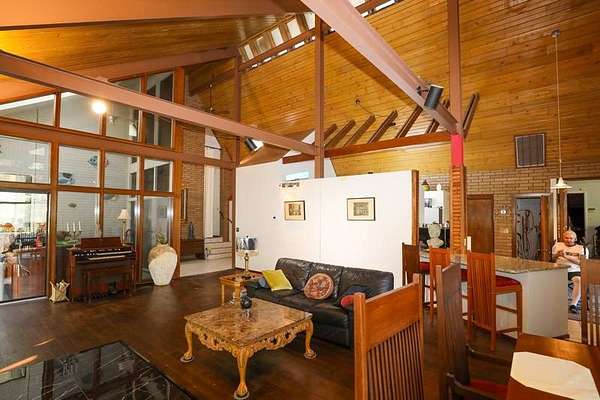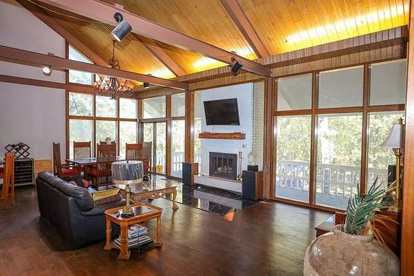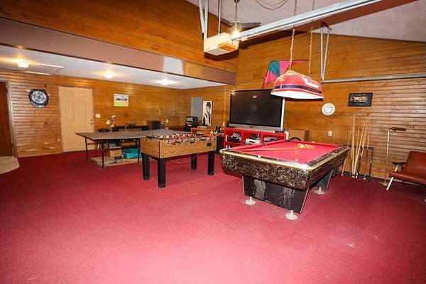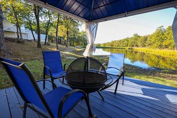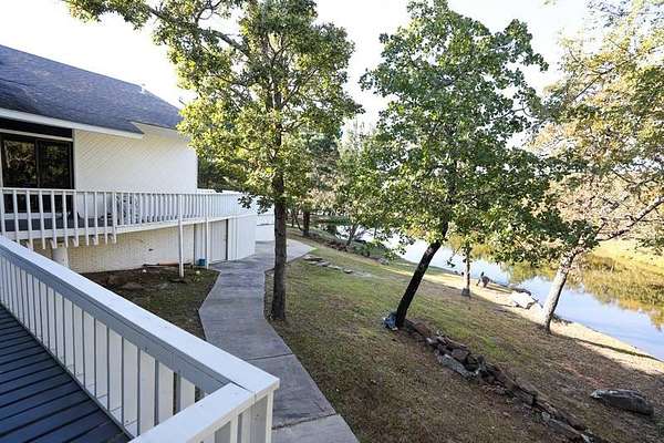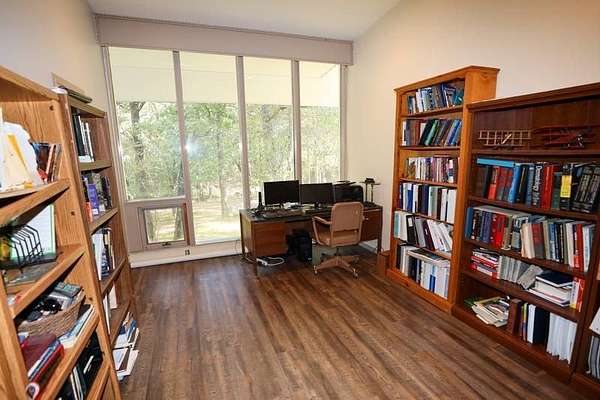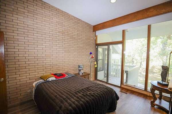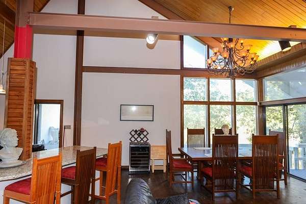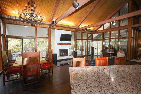 Architect-designed, Frank Lloyd Wright-inspired estate by renowned architect Robert Vahlberg, located just outside McAlester, Oklahoma. Set on two private acres atop a hill, the home is intentionally oriented east, allowing the main living areas and primary suite to enjoy daily sunrises overlooking a serene landscape reminiscent of Sherwood Forest, complete with a pond, seasonal babbling brook, stone walkways, and abundant wildlife Designed to harmonize with nature, the home reflects Wright's philosophy that a residence should belong to the land as naturally as the trees and stone around it. Walls, windows, ceilings, and open spaces work together with sunlight, elevation, and water features to create a structure that feels both peaceful and alive. The property offers approximately 6,200 sq. ft. under roof, plus 760 sq. ft. of decking and a 2,236 sq. ft. pool and entertainment area. The main house features elevated ceilings throughout, with dramatic height in the Great Room, floor-to-ceiling windows, Wright-style wood ceilings, an upgraded fireplace, and a Frank Lloyd Wright Foundation-approved dining set. The kitchen includes custom cabinetry, upgraded appliances (2025), and views of both the forest and front landscape. The primary suite showcases floor-to-ceiling windows overlooking the pond and trees, remote-controlled blackout blinds, a massive walk-in closet, and a spa-inspired bathroom with heated floors, waterfall steam shower, Swedish soaking tub, granite finishes, dual vanities, built-in storage, and bidet. Additional interior features include two guest bedrooms with deck access and a Jack-and-Jill bath, a large wood-paneled game room with pool table, ping-pong, foosball, media space, and a hidden loft, plus a former massage room now featuring a 12-person enclosed Jacuzzi with forest and pond views. A separate guest facility built into the hillside offers a heated and cooled garage, pool bath, tool room, washer/dryer, grill and griddle with commercial vent hood, and an upper level with kitchen, laundry, bedroom, and an event/dance floor with bandstand overlooking the pool, pond, and trees. Outdoor amenities create a true private-resort experience, including a 40-foot scuba-capable diving pool, fishing and kayaking pond, meditation gazebo beside the brook, forest trail system, pickleball/volleyball area, golf driving net, and gated RV parking. A long-lit fence and wrought-iron gated entrance provide privacy and presence. The home is elevated on welded steel I-beams, a rare and cost-prohibitive structural feature that lifts the residence into the trees for commanding views. Fully upgraded to a modern smart home, the property includes four HVAC systems, three water heaters, remote blackout blinds throughout, and full security surveillance. This is not just a home-it is a legacy property and private resort lifestyle, thoughtfully designed to honor the land and endure for generations.