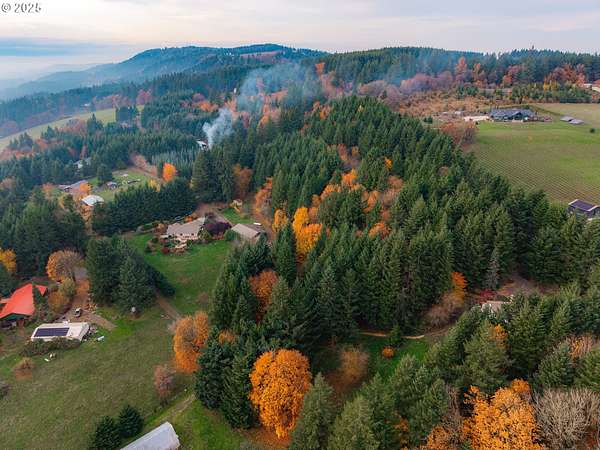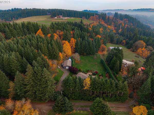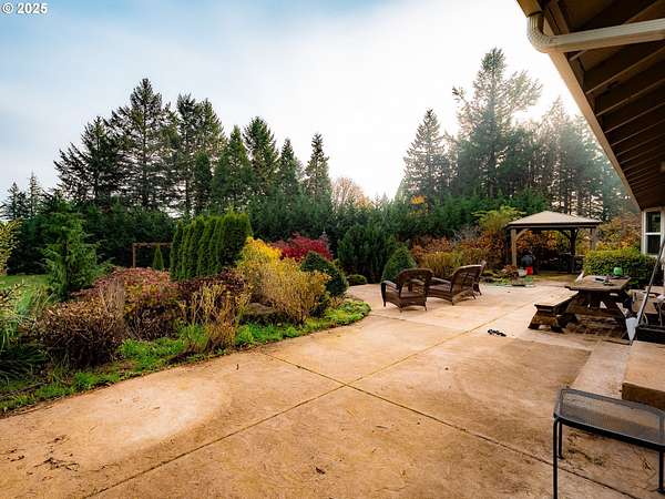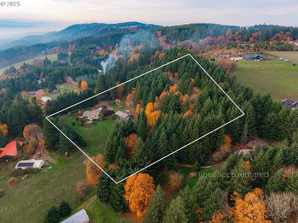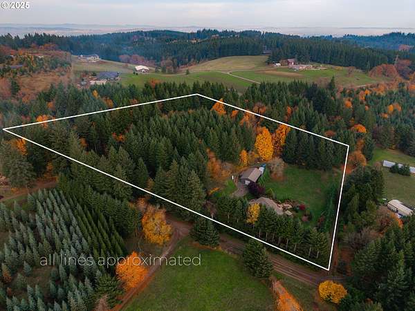 Dreamy, forested & private acreage just minutes to downtown Newberg & easy access to 219 & 99W. Custom built Ranch home offers two ensuites & two additional bedrooms with full bath access. Vaulted/Grand Great Room with floor to ceiling brick flanked 65'X16" propane glass encased efficiency fireplace open to gourmet kitchen with stainless steel, built in & upgraded appliances, quartz counters, eat island and informal dining area with access to patio. All luxury Vinyl plank floors, no carpet throughout home. Outdoor entertainers dream two level stamped concrete patio, firepit, pergola and lush landscaping. Beautiful pasture behind patio. Oversized two car garage. Full exterior concrete sidewalk around house. 37'X60' cement floor outbuilding/shop with office & bathroom has 15' ceiling, two 12' entry doors, storage for boats, RV and much more! Huge enclosed tent behind outbuilding for extra cars/storage. Fruit orchard with Bing & pie cherry, pear, apple & plum trees, kiwi vines, Pinot grape, seedless red & green grape vines & raspberry bushes. Garden area with raised garden beds. Chicken coop and large fenced area can also be a dog run. Upper two acres separated by driveway would have sweeping territorial views with trees cut down and potential for ADU (buyer due diligence at county). High efficiency Starlink internet but also DSL wired. 1000-gallon septic, 1000 gallon leased propane tank for fireplace & full house Generac backup generator, water treatment system, high performance hot water heater & heat pump, Trane furnace. Great producing well plus 3000-gallon cistern (2nd well on property capped) & two sprinkler systems. Ring doorbell and 3 exterior cameras for security system included. Outdoor faucet with cold and hot water. Forest deferred secluded property with low annual taxes. No HOA or CC&R's.