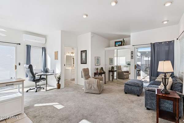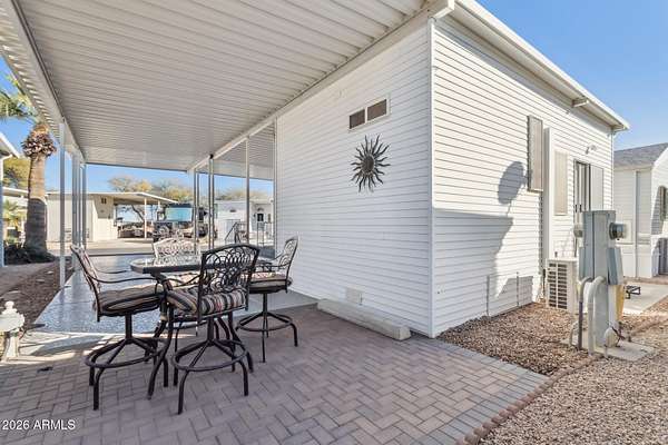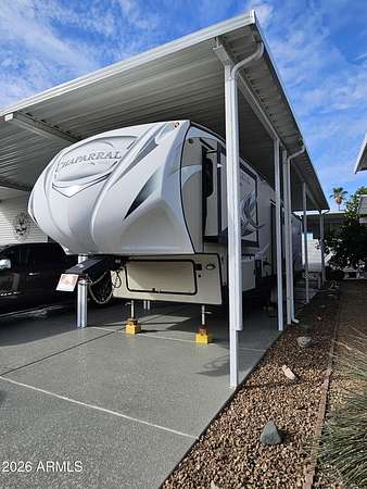 Stop renting and start owning! This unique property at Happy Trails is designed for the modern RV'ers who refuse to compromise on comfort. The heart of the home is a versatile 470 sq. ft. Arizona Room-ready to be configured as your ultimate lounge, hobby den, or suite. Live the perfect RV lifestyle that you dreamed about. This home offers covered RV parking with hook-ups on immaculate, stamped concrete with outdoor patios for entertaining. The open AZ room includes an bright kitchen with refrigerator, range, microwave, reverse osmosis water filter, disposal; a dining space; a media nook; a full bath; heat and a very efficient mini-split A/C unit; and, a loft accessible with stairs for extra storage, a desk or a blow up mattress for guests (the loft isn't included in the sf due to its low ceiling height). The attached shed features a washer/dryer and a dedicated workshop for your projects. A pull down ladder leads to great storage. Additionally, locked storage is located under the home. This 55+ Adult resort has so much to offer - pools, clubhouses, restaurants, golf, pickleball, tennis, a dog park, events, and more! Best of all - residents have a true sense of community and friendships. Your monthly HOA fees include water, sewer, trash, beautiful common areas, use of facilities and the peace of mind of a gated community. Furniture is included in this wonderfully comfortable and bright home.