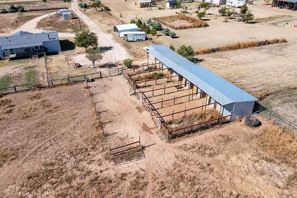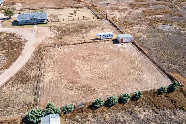 Awesome find in Eagle point!! 5 acre horse property 15 min. from WTAMU, includes pretty 3/2 home w/covered front& back decks to enjoy gorgeous sunrise & sunsets! Open floor plan easily flows to living, dining & kitchen areas. Recent updates per seller: primary bedroom floor, newly painted utility room, plus upgraded shelf, cabinet & drying rack. Previous owners updated the kitchen, primary bath, pressure tank and metal roof and HVAC!! Features a 6 stall barn, (great rental income at $100 per mo. per stall) 2 riding arenas, chicken coop, ample pastures plus a shop currently used for leather work, finished out with insulation, electric & partial drywall. Foundation is ready & engineer inspected for FHA. Owners love this home, moving for work, hope new owners love it too!!