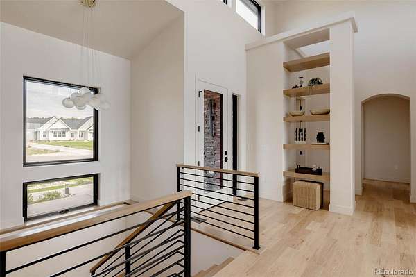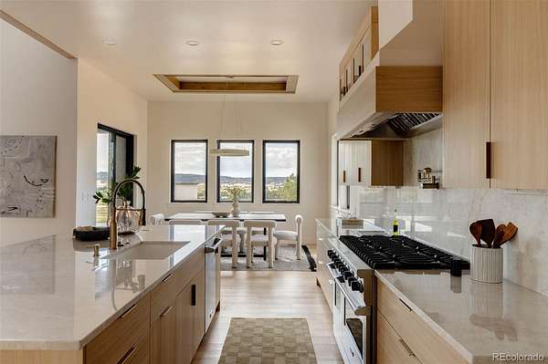 Perched on 2 pristine acres with panoramic views from every room, this brand-new ranch offers 5 bedrooms, 6 bathrooms, and a 3-car garage across 4,945 SQFT. The grand entryway with built-in shelving opens into an airy, open-concept main floor that flows from living to dining to kitchen. The dining room showcases coffered ceilings and designer lighting, while the gourmet kitchen features Taj Mahal quartzite counters carried up the backsplash, oak cabinetry, champagne bronze fixtures, and a custom hood vent. Chef-grade appliances include a gas range, Viking refrigerator, and a glass-encased wine rack, creating the ultimate entertainer’s space. Designer lighting enhances every detail, complemented by European white oak floors and graceful arches for timeless elegance.