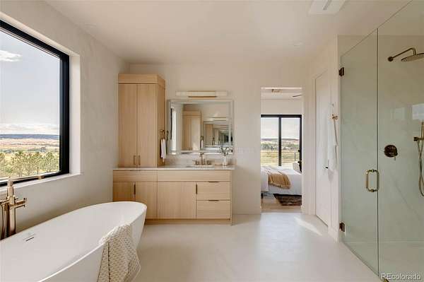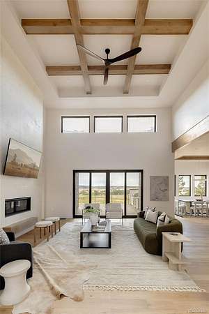 The powder bath is a showpiece with a wood-slat tiled wall, floating vanity, and exotic counters. The great room impresses with soaring two-story ceilings, wood beam accents, and a dramatic fireplace with built-ins and lighting. Sliders open to a covered patio with a built-in grill, perfect for gatherings. The primary suite is a private retreat with wood-beam details, a balcony with sweeping views, heated flooring, and a spa-inspired bath offering double vanities, a walk-in shower, European soaking tub, and dual custom walk-in closets.