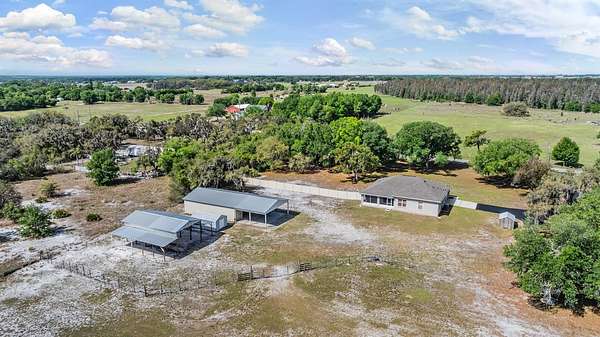 5 FULL ACRES, THIS IS COUNTRY LIVING AT ITS BEST WITH NO HOA! Bring your horses, boats, recreational vehicles, business or simply spread out with this custom-built home with plenty of room to add a pool and also includes several outbuildings close to the southeast corner of Hillsborough County. The 3-bedroom, 2-bath design has 9'4 ceiling heights throughout with a tray ceiling in the primary suite. The plan also centers everything around a spacious great room that opens through sliders to a screened porch and the sliders recess into the wall. There's a formal dining room in front as well as a windowed breakfast nook beside the open kitchen, which really stands out with raised-panel wood cabinets and split-level countertops. The home also has a central vac system. The roof was replaced in 2022 and a brand new 50 gal HWH. Home has maintained an annual pest control service. Other extras include designer lighting, a leaded-glass entry door and a spindle-rail front porch. Of course, the value of the property extends far beyond the flexible floor plan. You also get a metal workshop that is 30 x 40 with a 24 x 30 attached carpot and a 10 x 12 rollup door with water and electric. There is also a smaller metal shed beside it that is 12 x 20 which comes with a Ingersoll Air Compressor-80gallon with 100' hose reel in the workshop. There is also a 40 x 40 pole barn that is perfect for parking your boat, toys or RV. There is a 10 x 12 horse stall next to a chicken coop that measures 8 x 8. The chicken coop has great bones it just needs some TLC. Acreage around the home is level, cleared, and mostly fenced. You are within 10 minutes of a major shopping site and commuter routes to Tampa or Sarasota, yet you're miles away in terms of peace and privacy!
