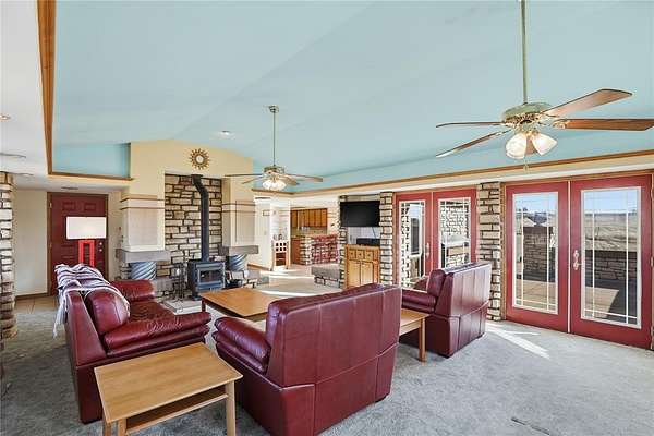 From the moment you arrive, you'll notice the stone exterior, metal roof accents, and built-in flower beds, setting the tone for a home full of warmth and architectural detail. Inside, the massive open-concept living area is anchored by stone columns, vaulted ceilings, and abundant natural light pouring in through walls of windows and multiple exterior doors, creating a true indoor-outdoor living space.