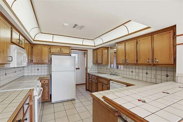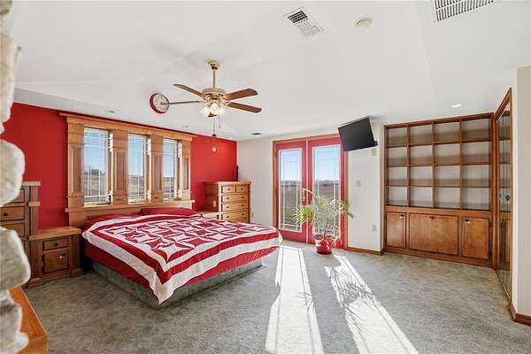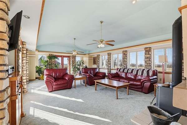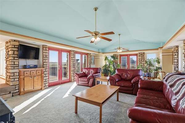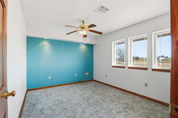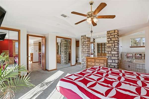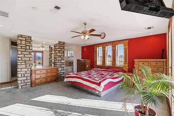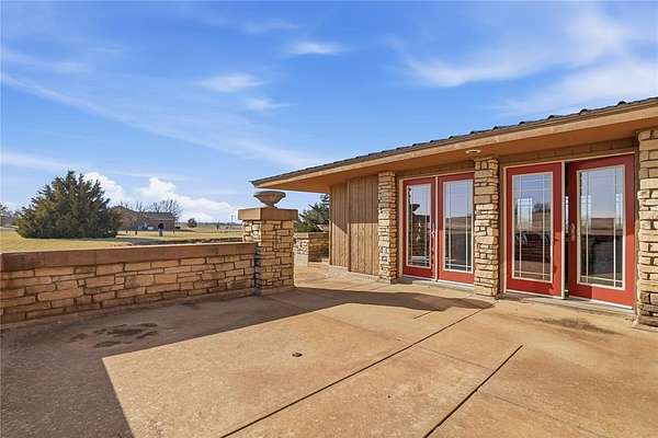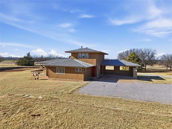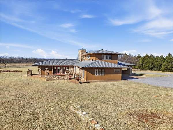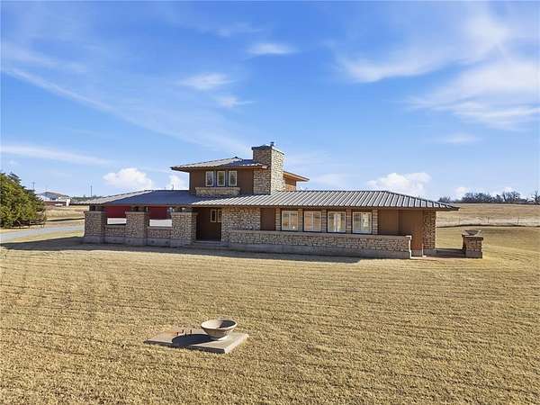Welcome to this one-of-a-kind custom home in Apache, OK, where Southwest architecture meets wide-open Oklahoma views. Nestled on 2.6 acres, this property offers privacy, space, and character you can't replicate with new construction. From the moment you arrive, you'll notice the stone exterior, metal roof accents, and built-in flower beds, setting the tone for a home full of warmth and architectural detail. Inside, the massive open-concept living area is anchored by stone columns, vaulted ceilings, and abundant natural light pouring in through walls of windows and multiple exterior doors, creating a true indoor-outdoor living space. The living space flows seamlessly into the dining area and kitchen. The kitchen features generous cabinet space, tile countertops, and plenty of charm. The oversized primary suite is a true retreat, offering space for a sitting area, large furniture, or a private reading nook. The en-suite bathroom includes dual vanities, a tiled walk-in shower, and a soaking tub framed by custom tile-work. Additional bedrooms are spacious, filled with natural light, and offer flexible use for guests, home offices, or hobbies. This home offers the tranquility of country living with convenient access to nearby towns, schools, and everyday amenities. If you're searching for a custom home on acreage in Southwest Oklahoma with character, space, and timeless design, this property is truly a rare find.